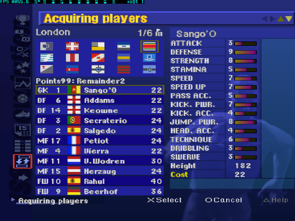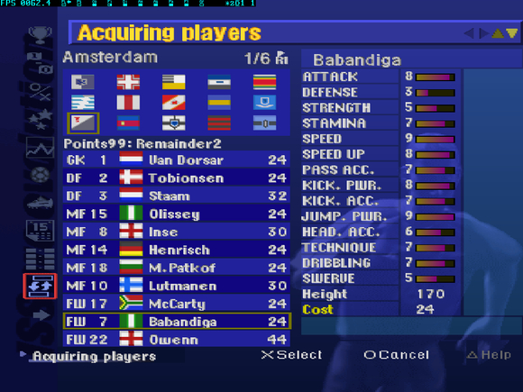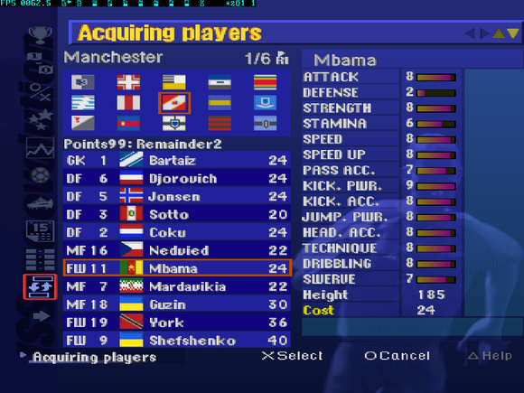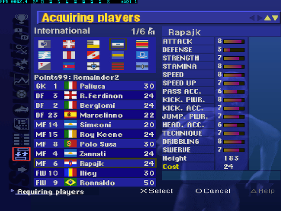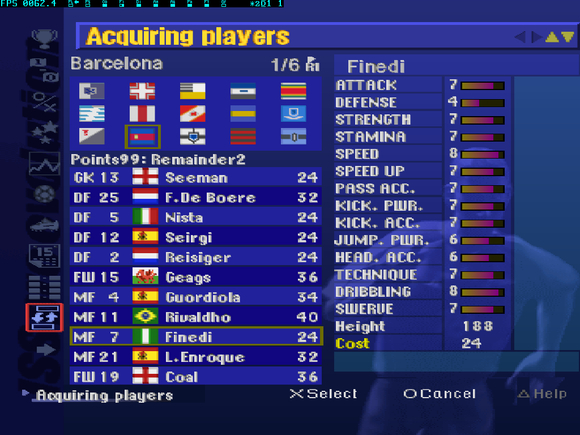 1. 用金手指锁定99金钱和 购买球员人数不减 2. 电脑换球员的条件,只能换对应位置的球员,如FW一定换的是FW,直到给电脑换到能力值和身价高的球员 电脑优先会交换欧洲球员,GK由于门将人数不多,把22人的位置占满后,电脑会交换美洲,亚洲,非洲的 电脑不会交换世界明星队的人,如巴蒂斯图塔、奇拉维特、坎波斯等,换人的时候特别注意 电脑会交换到欧洲全明星的球员,如曼联有明星队的巴特兹,摩纳哥也有法国的巴特兹,我还给电脑换出过欧洲明星队的吉格斯、博班等,不过MF前腰有厉害的球员了就又换走了。 电脑换欧洲以外的球员,大概率不会再换到欧洲以外的球员了,一定注意非欧洲高能力球员的的交换 3. 一周交换球员的成果图如下,联赛难度陡然增加,你可以试试现在这个存档,不购买电脑俱乐部的球员玩玩 ![]() ![]() ![]() ![]() ![]() ![]() ![]() ![]() |