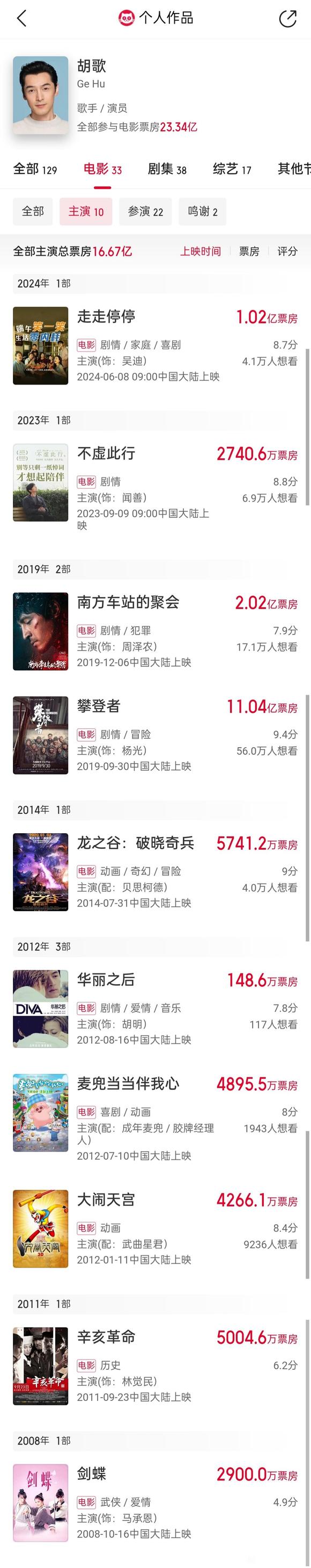 胡歌算什么流量,他🔥已经是二十年前了,而且他主要混电视剧圈的,能从剧圈完美衔接到电影圈的我印象里就两个,徐峥和王宝强