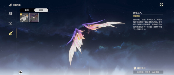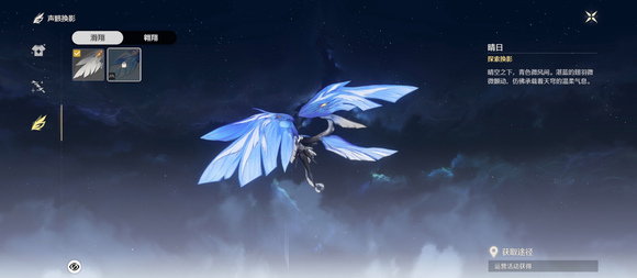 游戏里已经可以查看了,名字叫“晴日”,获取方式写的是:通过运营活动获取。蓝色的翅膀是滑翔时候(滞留空中),粉色的翅膀是2.0地图飞的时候用的,这两个翅膀看起来是分开的诶?不过这个运营活动会是什么呢?期待一下