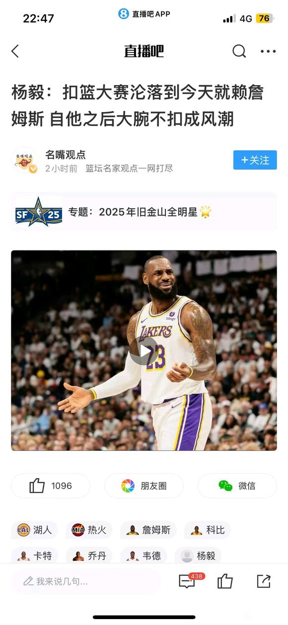: 杨毅老师说的没错,这詹姆斯从他开始就耍大牌!这不参加那不参加的,就突出一个啥都会一点啥都不精!看看乔丹科比都有扣篮大赛冠军🏆,而詹姆斯就不敢战!这跟乔丹科比怎么比?高下立判!只要不参加就不会输!就怪他 ...