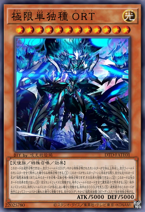 极限单独种 奥尔特这张卡不能通常召唤。自己场上有从额外卡组特殊召唤的怪兽5只以上存在,把自己场上的怪兽全部除外的场合才能特殊召唤。①:只要这张卡在怪兽区域存在,自己不能把原本卡名是「极限单独种 奥尔特」以外的卡召唤·反转召唤·特殊召唤,也不能把那些卡的效果发动。②:这张卡不受其他卡的效果影响。③:自己结束阶段发动。对方场上的卡全部里侧表示除外。④:对方结束阶段,对方场上没有卡存在的场合发动。对方失去5000基本分。⑤:表侧表示的这张卡因对方从场上离开的场合才能发动。从额外卡组把1只「极限单独种 奥尔特·宇宙圆盘」特殊召唤。