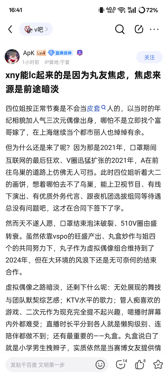 本来就是四个底边偶像在团内混不下去了才来当v的,三十岁天天接触一堆男人的臭底边偶像有几个富哥会要,你以为她们是明星吗?就是个不知名的底边团体里的四个团内底边个体罢了,离娱乐圈差了十万八千里呢