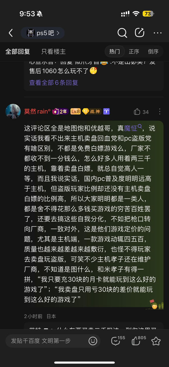 | 这段话看似在“揭穿伪善”,实际上是把合法行为和非法行为混为一谈,用穷酸感掩盖逻辑崩塌。 首先,主机玩家卖盘回血是市场机制内的正当行为,是基于实体产权的再交易,法律支持,平台默认,厂商知情并设计了对策。而盗版则是彻头彻尾的侵权行为,不管你穷不穷、有没有“白嫖情怀”,你就是拿了别人辛苦开发的东西一分钱不给,这是事实性犯罪行为在很多国家。 你硬把“主机回血党”和“PC盗版党”拉在一起,说什么“都让厂商赚不到钱”,那我请问:*你买了游戏再卖出,和你从未买过、纯靠非法下载,怎么能相提并论?这不是逻辑,是偷换概念。 再说你那个“大家都穷所以都合理”的论调,听起来确实很“底层觉醒”,可惜是拿穷当借口去正当化违法行为,而且你一边骂厂商定价高,一边又看不起愿意多花钱支持正版的玩家,这不是“双标”,这是什么? 你甚至嘲讽“主机孝子”,说人家亏30块玩个正版游戏,可你连30块都懒得掏,靠盗版活着还要嘲笑比你更有底线的人,这就是典型的又当又立。你说国内PC普及率高但盗版比例没主机回血高——你以为那是光荣吗?那只是盗版环境更猖獗的证据罢了。 最后你说“把枪口对准厂商”,可你要真有本事,就组织抵制、投票、不买,让厂商调价,而不是一边下载盗版、一边键盘革命。你的“枪口”根本不对准厂商,只是在为自己的懒惰和不愿付费找借口。 你不是在反抗厂商,你只是想理直气壮地白嫖。 ![]() |
