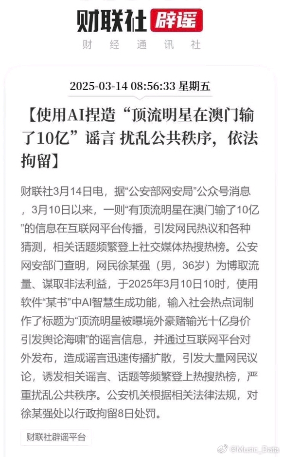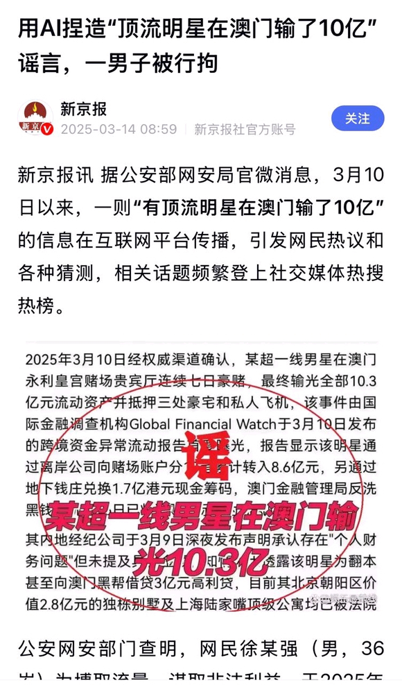 : 官方出手!使用AI捏造“顶流明星在澳门输了10亿”谣言扰乱公序良俗的徐某已被公安部行政拘留!