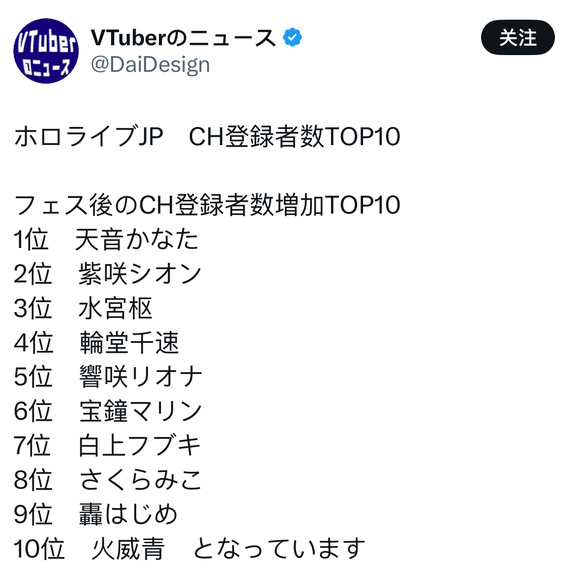 : 虽然在fes上没能拿到大明星舞台,但是fes结束后涨粉趋势良好,现在又连续拿到两个大工商,社内地位急速上升,1st sololive指日可待了