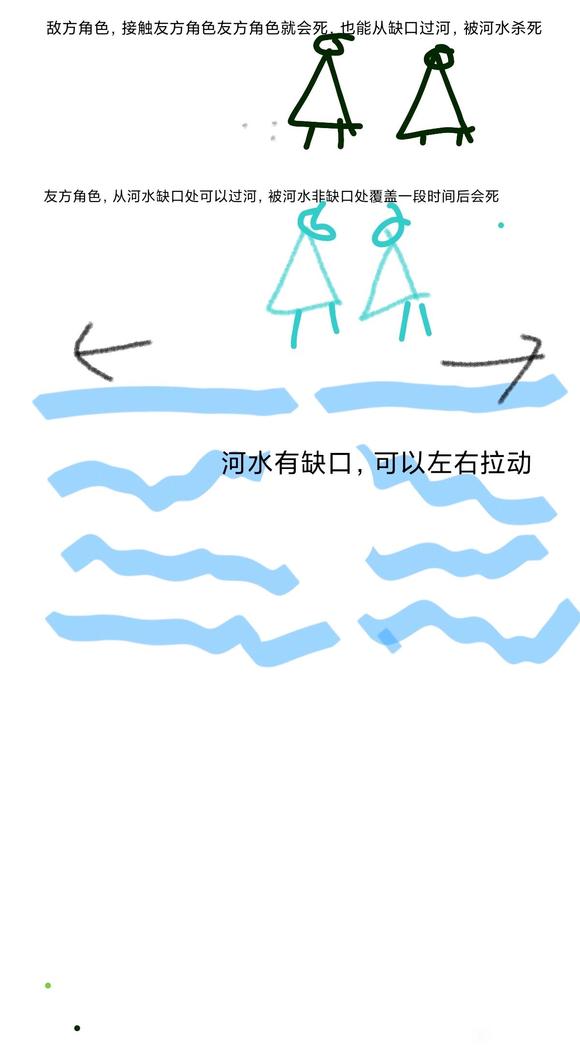 游戏应该是在一零年左右的一款手游,游戏里的角色外形都是类似于三角形,游戏的主要玩法是操控河水让位于屏幕上方被敌人追逐的人到屏幕下方来获救,游戏大概是纸质风,河水也是蓝色的底子白色的轮廓,和纸一样可以左右拉动,不能直接操控角色,只能操控河水,己方和敌方角色都可以从缺口处过河,被非缺口处的河水覆盖角色一段时间后角色就会死亡。