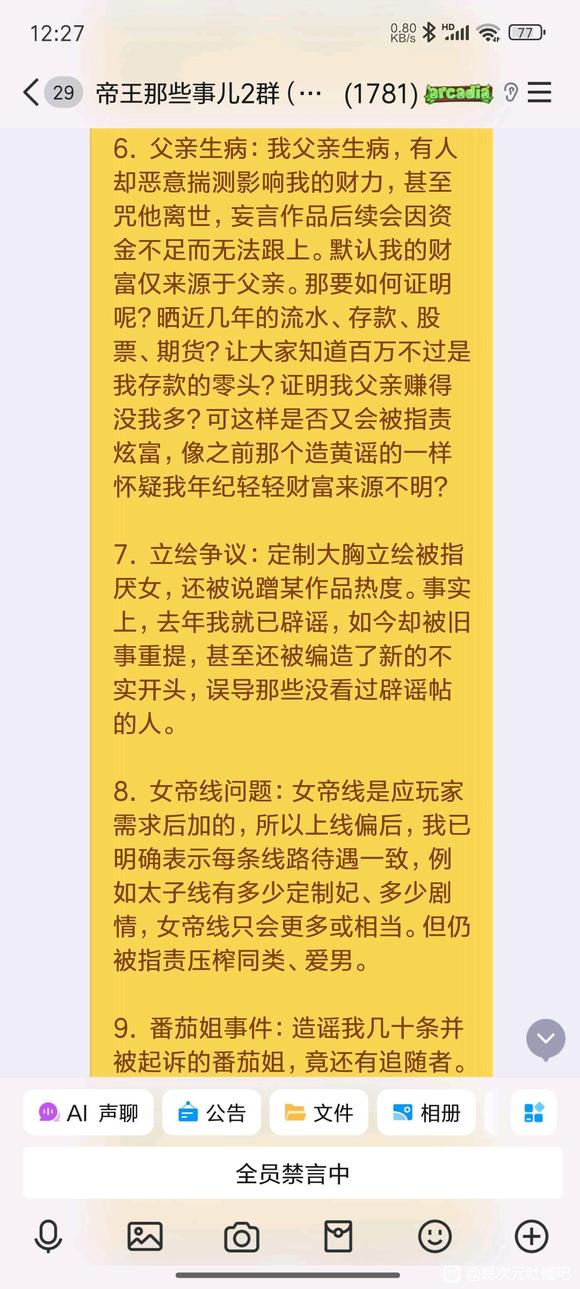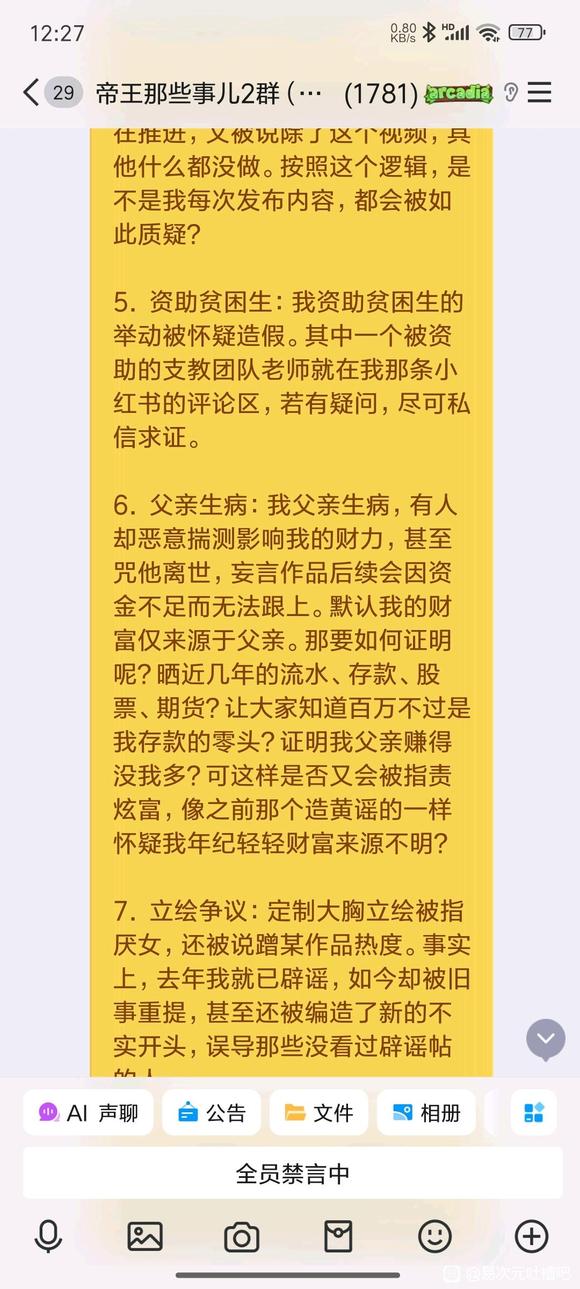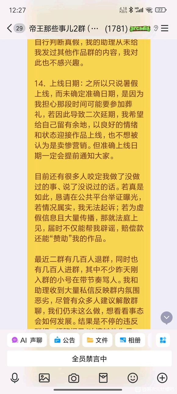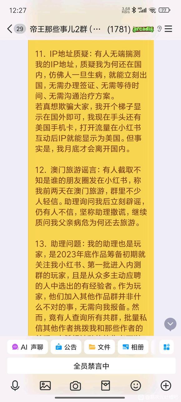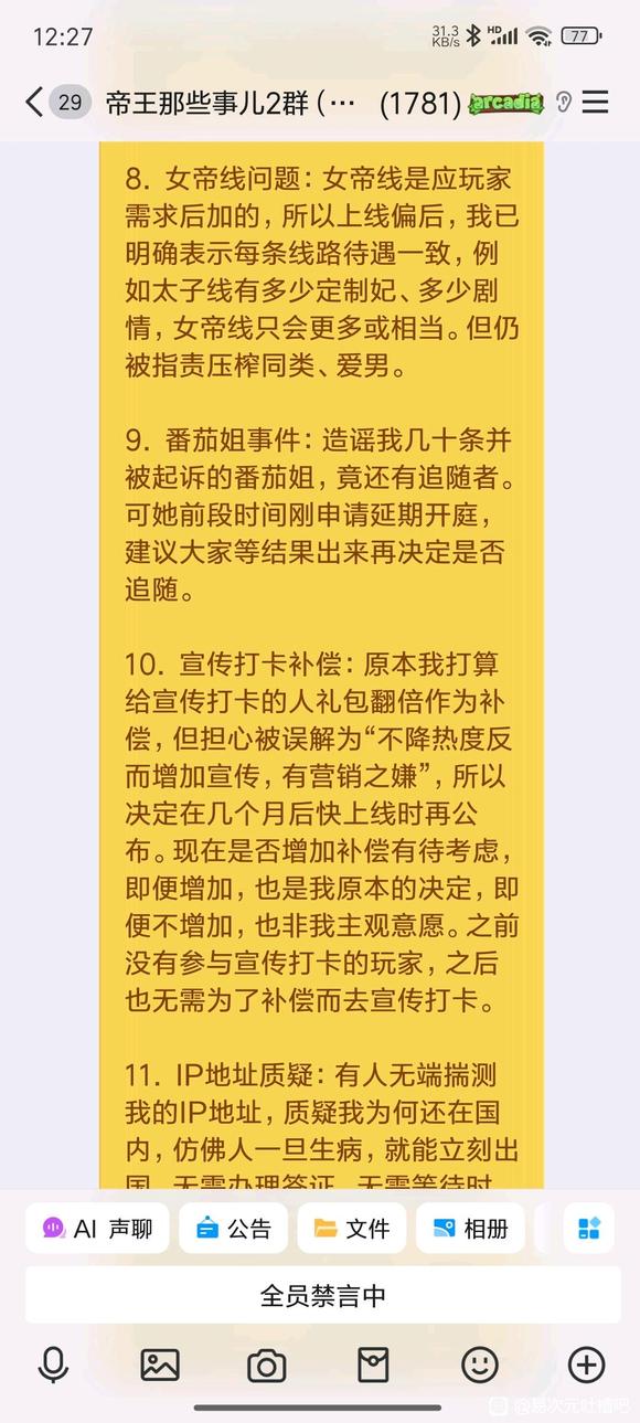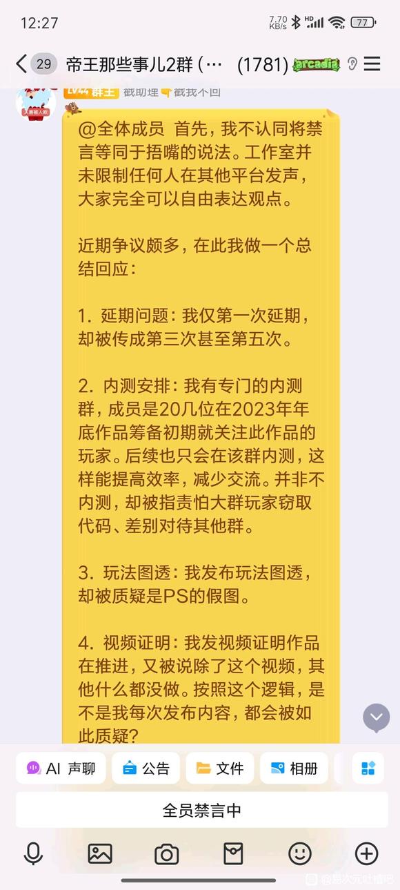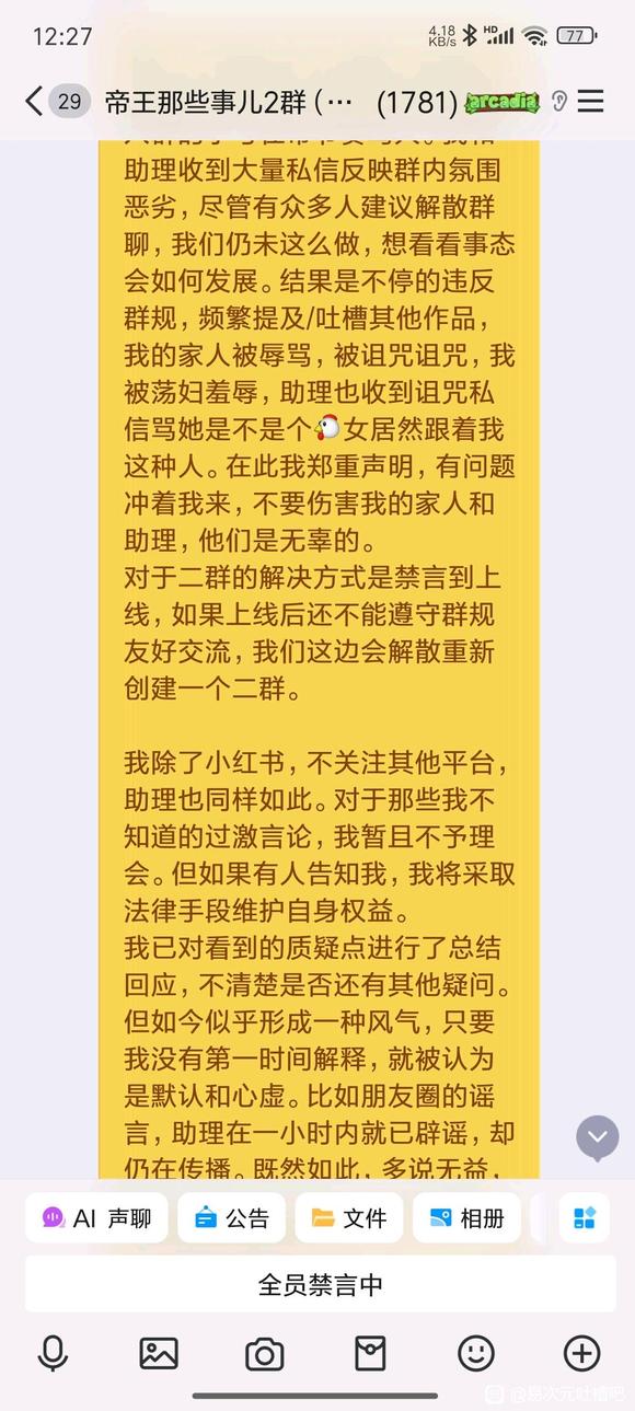然后她发一大篇长文的意思就是:我的内测只给我的腿毛玩,我的延期福利我想加就加,不想加就不加,我已经给你们二群机会了,然后你们还骂我,那我只好禁言了