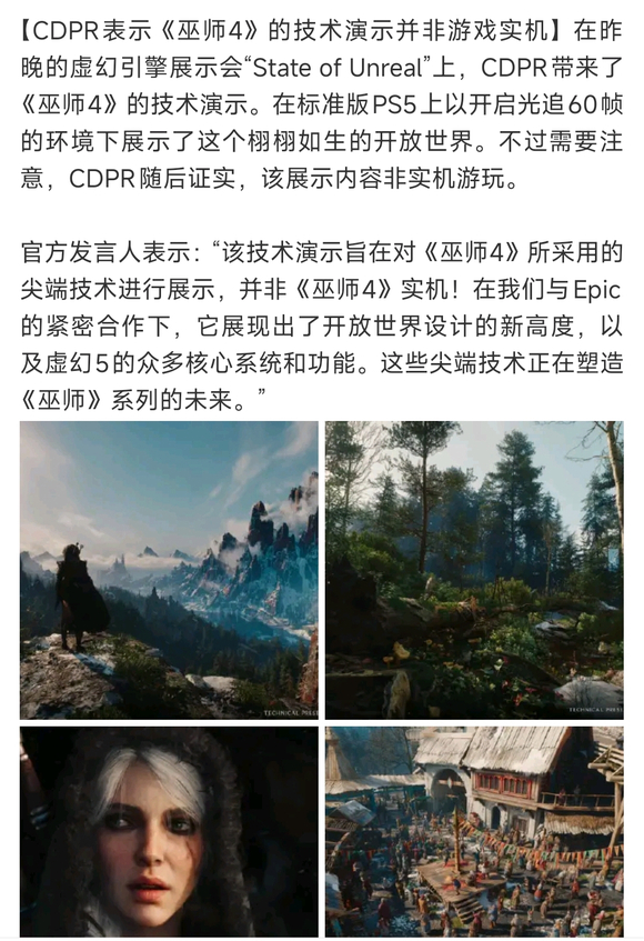 是不是实机一眼就看出来了,这就是游戏实机。在ps5拉满光追60帧运行的巫师4技术演示demo这里潜台词就是未来可能缩水