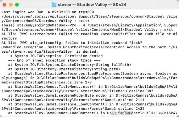 它这不是告诉你了吗,没找到对应文件,而且没有对应的权限你先验证游戏文件完整性,把缺失的下载回来然后修复文件夹权限打开终端输入chmod -R u+rw ~/.config/StardewValley