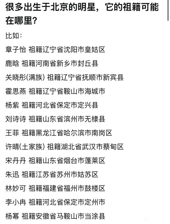 北京大多数都是环渤海的,山东河北东北为主,但是建国初期从湖南江浙安徽掉了不少技工和大学生人才过去,而文艺界最早是前朝遗老遗少的满满和回比较多,都是清朝留下来的,毕竟满满不会种地,刚解放的时候只能说相声唱歌跳舞唱戏一类的方法湖口,回民主要演员多,样子长的当时来说还好