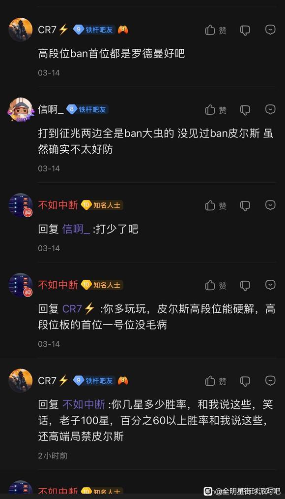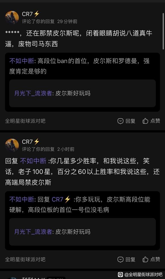 我就说了句你多打打,他就开始出言不逊,我不知道这些人怎么这么狂,跟个唐人一样。没人教他说话吗?如果有人质疑,可以看看高星主播,我也可以截图我打的,皮尔斯肯定强度够的,目前首位ban一号位存在。