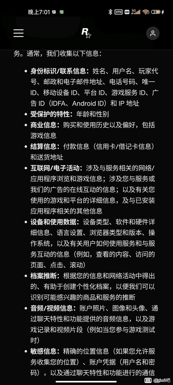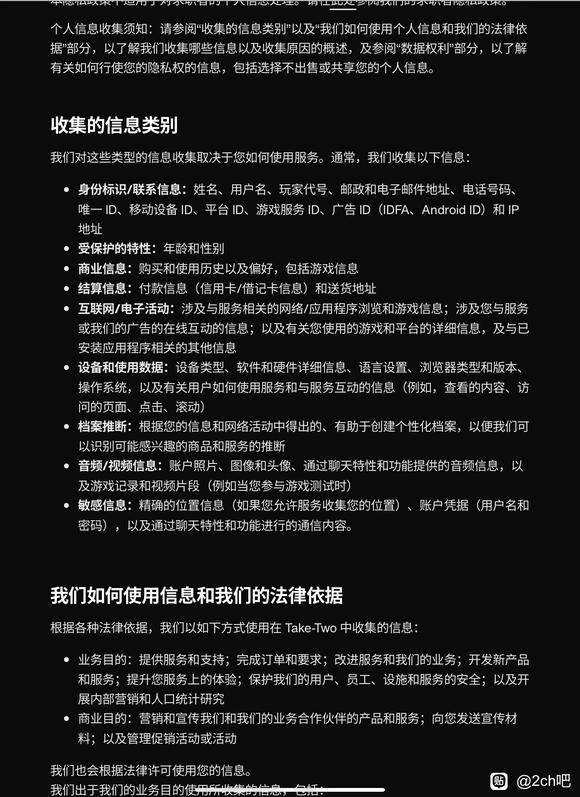 越傳越離譜系列。但凡去看看原文就知道是普通的隱私收集協議,沒啥奇怪的,所謂的收集信用卡密碼純粹無稽之談。原文意思是,付款的信用卡,地址信息,這裡的信用卡信息類似于支付寶賬號吧,至於密碼是寫在其他地方的,指的也是你的r*或者2k賬戶密碼,不知道怎麼就變成了收集你的信用卡密碼這種離譜的謠言…值得關注的點一是就那個除澳洲,歐洲外,包括美國在內的,放棄集體訴訟權力,接受強制仲裁的條款。二就是2k可以隨時修改該協議,玩家需要自己隨時確認,這個我不太能接受,按道理應該原協議作廢,重新彈出新協議要求玩家同意後繼續吧?誇張點,我之前同意,你修改協議説玩這個遊戲的人的存款都是2k的,是不是也成立啊