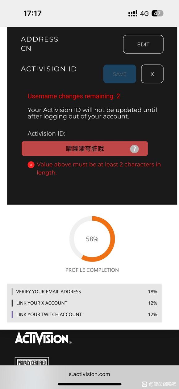 : 游戏里改不了,动视官网也改不了