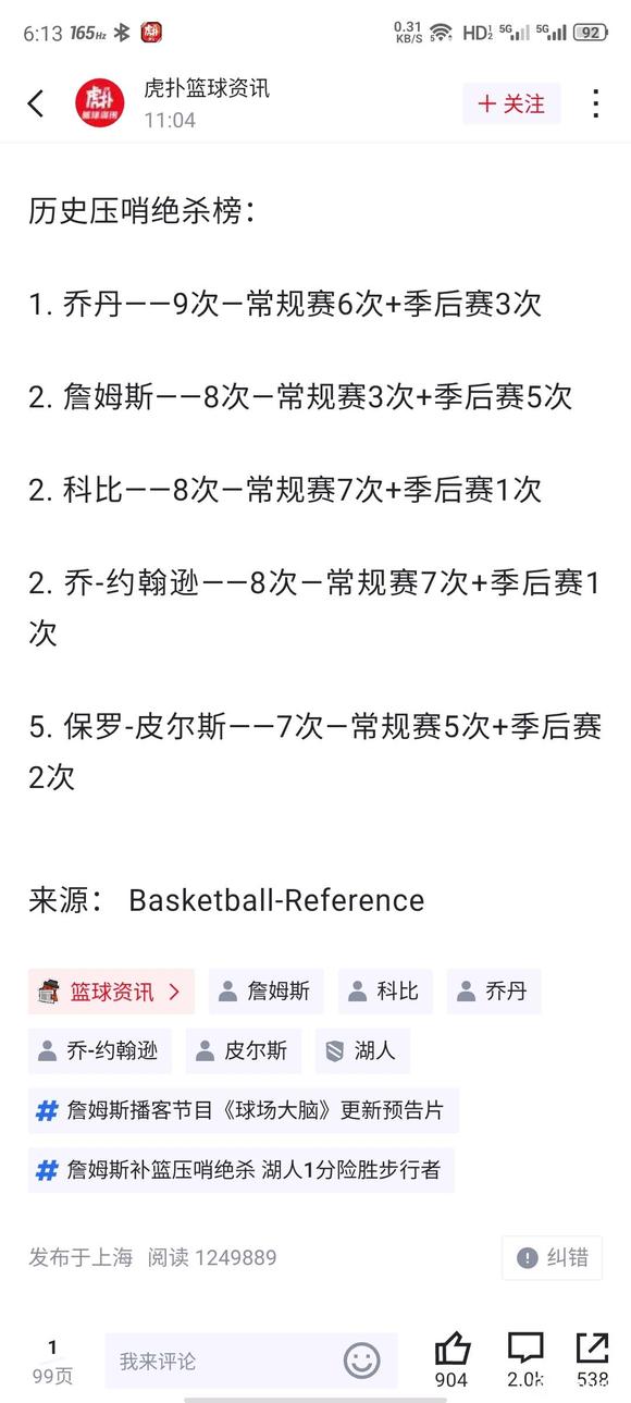 为何榜上詹姆斯季后赛压哨绝杀比例最高 科比最低?