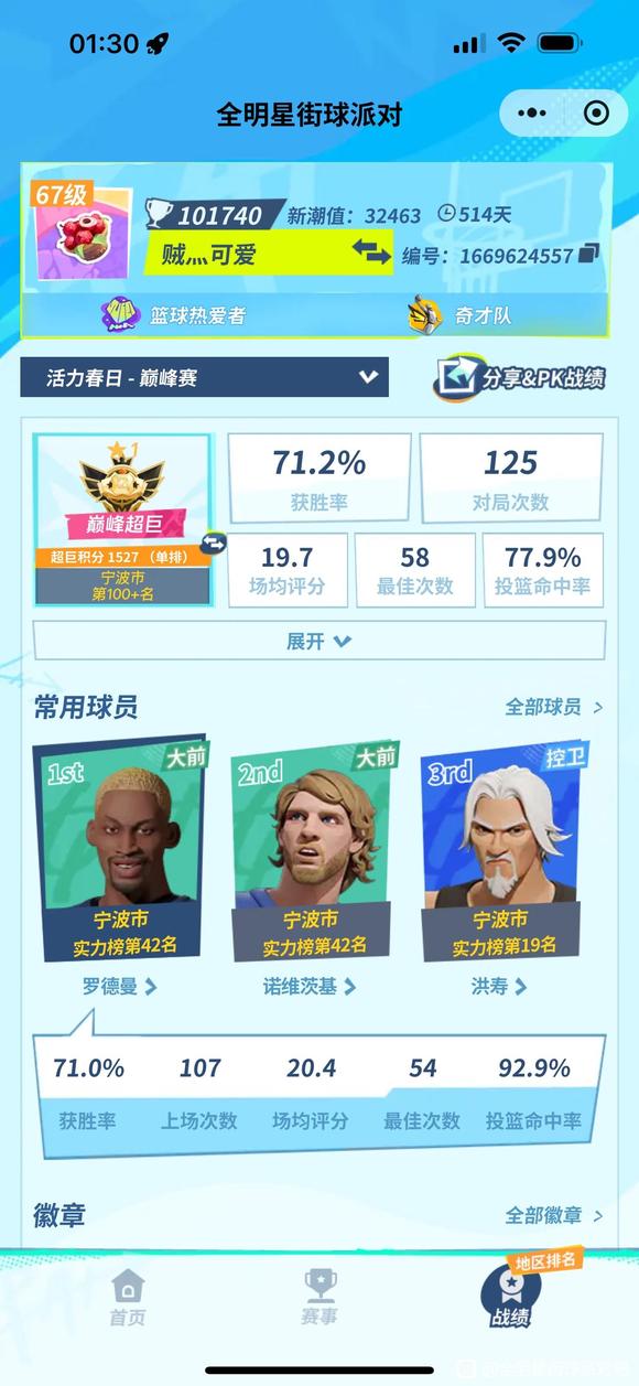 娱乐几把为目的,沉迷了两赛季11分刷杯摆烂之后再上超巨。之前被吧友嘲讽钻石狗巨星狗啥的,再加上周末球馆赛没个超巨不好组靠谱队友,想着还是得熬夜抽时间打打。其实每赛季胜率都蛮高的,磨磨唧唧玩个几十把就不想玩了。没固定时间组不了固定队伍的带娃老男人心气也就到这了。