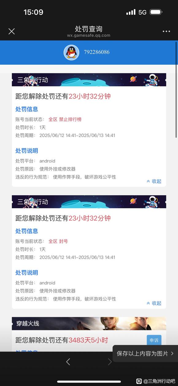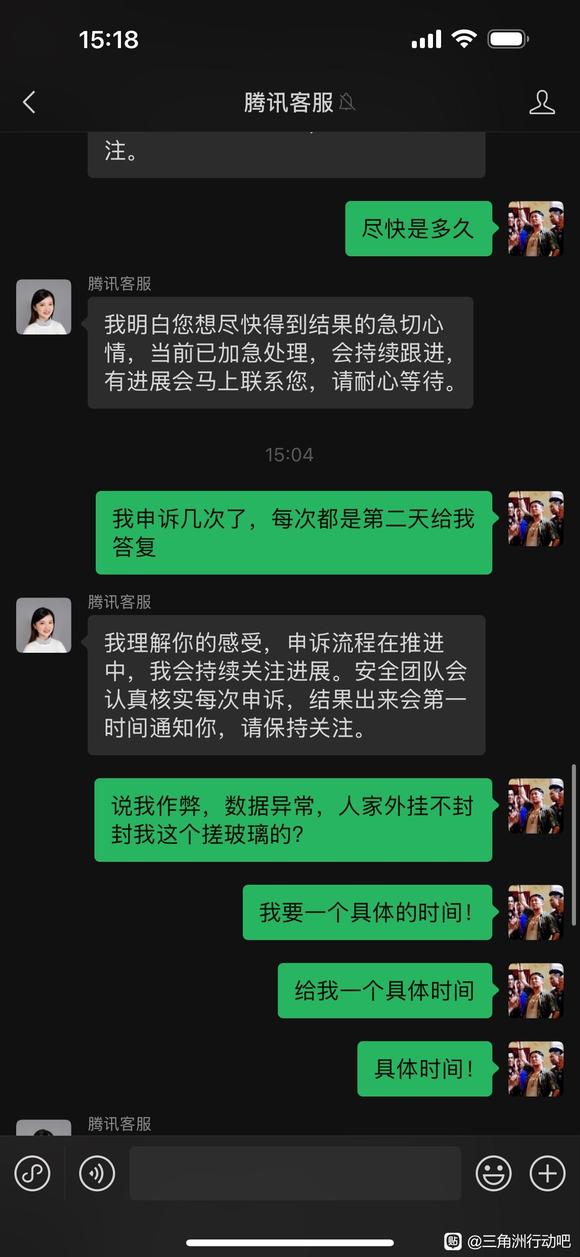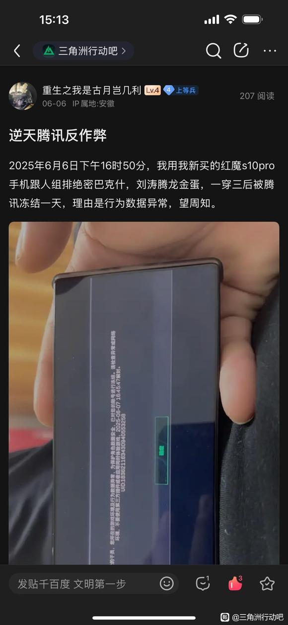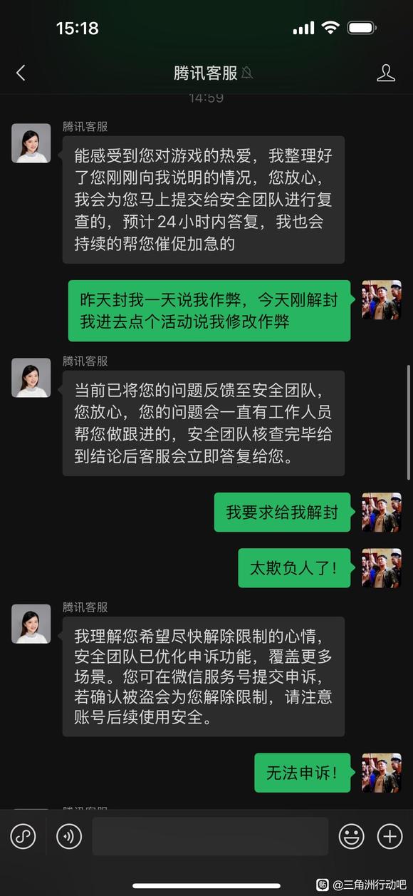 新买的红魔s10pro,在6月6日绝密巴别塔一穿四之后封号一天,说我行为数据异常,6月11下午14点22分我用手机整理仓库,说我第三方修改器或者作弊器,封禁一天,6月12日下午我刚上游戏,一局游戏没打,在仓库页面给我封禁,说我使用第三方作弊器或者修改器。找了腾讯客服,人工客服的答复跟人机没区别,我真想问问三角洲,开挂护航打手不封禁,做挂车不封禁,我没打游戏能被封禁。