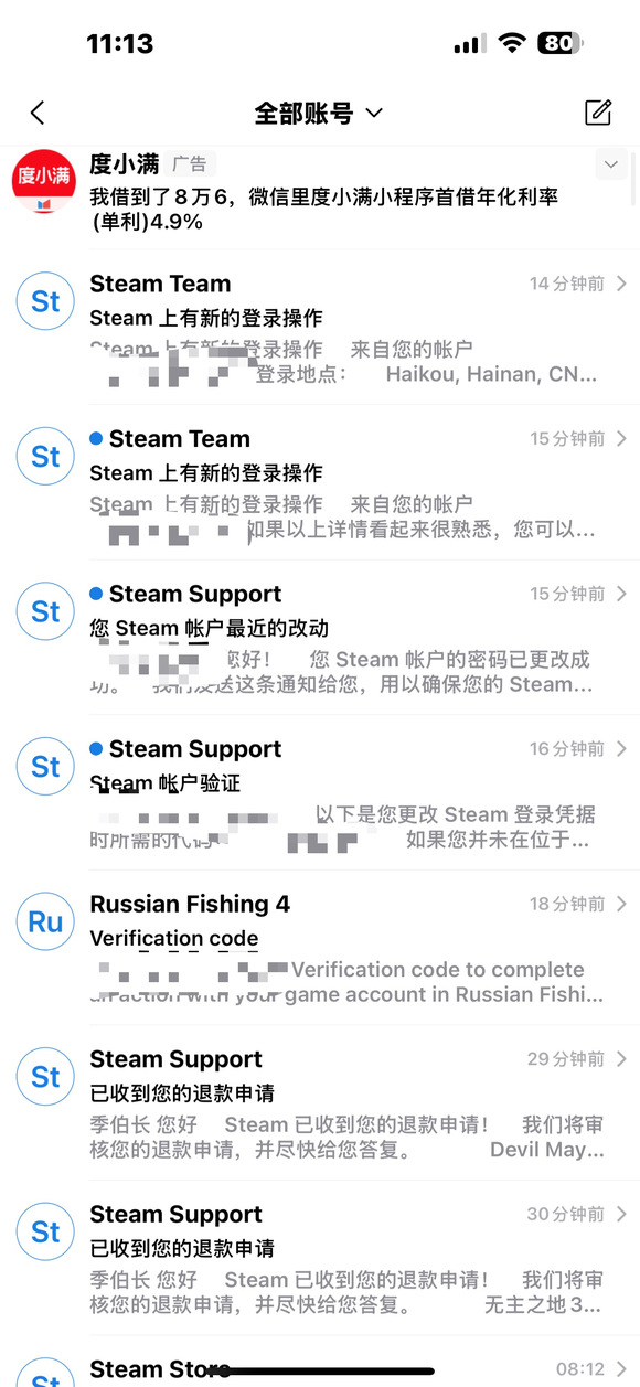 今天早上上班刷手机收到QQ邮箱提示steam有游戏退款提示,我打开令牌查看交易明细盗号的给我冲了16块钱接着在俄钓4里冲了三天会员,我立马翘班回家打开游戏登录上去发现人在白河,包里的12W和17金币以及包里的顶红咖啡金币饵全没了,包里还多了116条鱼,我是凌晨1点下线的,鱼获的时间是凌晨两点,朋友说被拿去开脚本了,封了号东西也就找不回来了,天塌了,有遇到同样问题的吗
