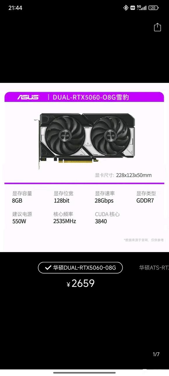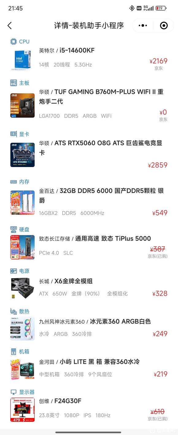 小程序没有搜到华硕DUAL-5060-08G,用ATE 5060替代一下。实际是买2659块钱的DUAL-5060。显示屏和固态硬盘都是以前买了给笔记本用的,准备拆下来给主机。主板和CPU买的套餐2169块钱。不算显示屏加起来6560块钱。