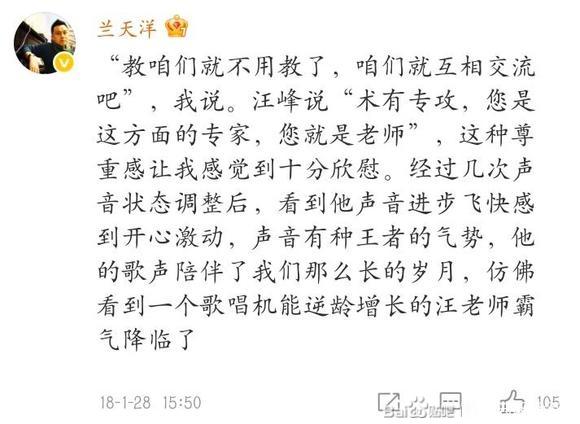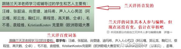 他若不揭云朵的短,也没人想打他的脸。说师生关系就师生关系,到你那学习也不丢人,但非得把人说得不堪入耳就不对了。2015年前的云端音难道都是有毛病的,喜欢听一个“高音那块儿有点费劲,太挤卡,气息不稳,基本功明显还得再好好练练”的歌手唱歌?一句想抬高自已的话,即贬低了云朵、又嘲笑了那时的云朵粉丝。假如用略有瑕疵、偶有气息不稳这些词会显得你不厉害吗? 兰大师曾说:学艺术要求你有非常非常好的文学修养,现在看来也就是“狗”承担了所有,怡笑大方。修养呢?摆事实讲道理,骂人显然就不对了。 ![]() 他也曾经组建过乐队并担任主唱和键盘手。照理说更懂得尊重歌手。自已没有知名代表作不能说明你不优秀,但没有代表作还出来作多少还是悠着点。 《歌手》节目中人家汪峰就是客气一下,他居然就把汪峰说成是自已学生,还顺便把《歌手》节目的大量明星都“收为”了自已的学生。 ![]() 当然他可能也觉得挂不住昨日在抖音发的宣传资料,略有修改,添加了些模棱两可的语句,不过依旧没有“放弃”这些明星学生。一定硬要“辅导过”,就那么好为人师吗?实在想要与明星搭上关系,写“合作过”也不掉身份吧。 ![]() 如果没有这次事件,估计这里面提到的明星自已都不清楚,原来在兰的认知里面,他们都是学生而已。百科词条里的人物关系中,与兰天洋是师生关系的词条只有两位,其他“学生”的词条显然没有同意与他确认这种师生关系。就看他接下来怎么改自已的词条了。 ![]() 《歌手》声乐总监应该是自封的吧,目前没有看到哪期节目有如些介绍和字幕。他只是某几季专家顾问团的一员。比他有名的山河、高晓松、伍洲彤、袁惟仁、科尔沁夫等也没有成为哪个参与节目的明星的老师吧。 以前兰大师在央视演唱《如果云知道》的翻车现场;演唱《秋意浓》的假唱质疑,也许他觉得都是设备问题,更是网友的问题。 兰大师你如果要支持云朵,那就请先尊重云朵。尊重合作过的艺人,“好为人师”、“夸大宣传”并不是什么好品格。 |