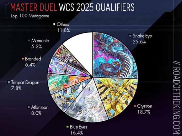 19.17 蛇眼 (18.67 千年刻魔蛇眼眼, 0.5 千年俱舍刻魔蛇眼)14 水晶机巧(13 千年水晶机巧、1 荷鲁斯水晶机巧)12.33 原石白龙6 海皇水精鳞5.83 天杯龙(5.5 天杯龙、0.33 闪刀天杯龙)4.83 烙印(4.33 60烙印,0.5 40烙印)4 莫忘2 机关傀儡2 幻奏1 俱舍刻魔白森1 刻魔尤贝尔1 俱舍刻魔珠泪1 超重龙剑士0.5 刻魔深渊之兽0.33 超重型武士FTK在此统计中,如果玩家使用了多套不同的卡组,则每套卡组的权重将除以总卡组使用次数。例如,サーモン的全球排名为第29位,在决斗者杯赛中使用了3套不同的卡组,因此为总卡组贡献了0.33套“千年刻魔蛇眼”、“原石白龙”和0.33套“闪刀天杯龙”