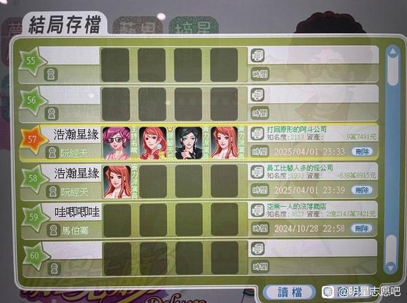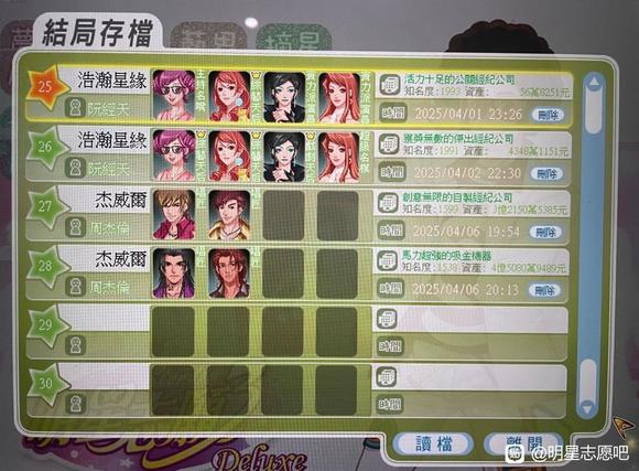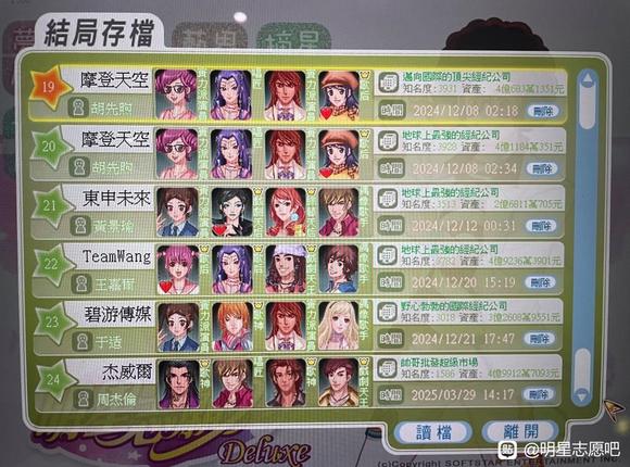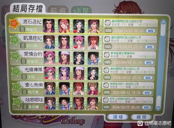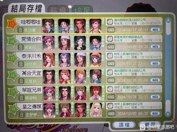 这个我时不时要拿出来玩一玩的少女时代最爱的游戏,要打到八十岁的童年回忆:明星志愿2️⃣、2000和3️⃣ 最近想把3️⃣的公司结局都打出来,目前完成了16个,分别是地球最强的经纪公司、野心勃勃的国际经纪公司、迈向国际的顶尖经纪公司、贺总承认的一流经纪公司、星光闪耀的天王天后宫、获奖无数的杰出经纪公司、创意无限的自制经纪公司、活力十足的公关经纪公司、潜力十足的普通经纪公司,爱情万岁求婚事务所、帅哥批发超级市场、马力超强的吸金机器、挥霍无度的业余精品店、打回原形的阿斗公司、员工比艺人多的怪公司、空无一人的落寞商店。还差6个:进军国际的杰出经纪公司、美女无敌量贩中心、一板一眼的冷血经济工厂、惨无人道的人间炼狱、不务正业的菜鸟集散地、白忙一场的倒闭经纪公司。 才发现,这些奇奇怪怪的结局比最好的结局都难打😂😂😂 美女无敌量贩中心打了三次都失败了,跟别的结局重叠了啦好累😔 ![]() ![]() ![]() ![]() ![]() ![]() |