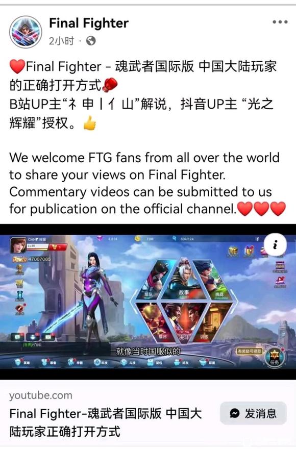 游戏下载链接:http://cdn.funbirdgame.net/apk/FinalFighter.214988. apk请务必注册账号玩,游客账号百分百丢。游戏登录界面的两个G或者FB账号怎么注册可以在B站和百度搜经验帖和教程[呲牙]