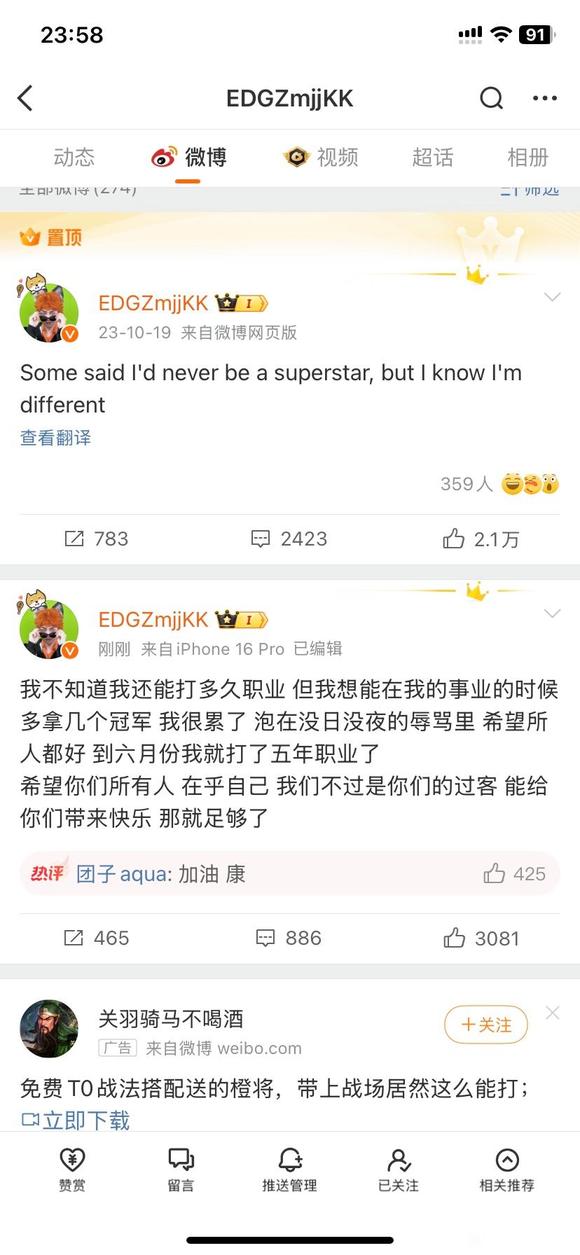 球球这时候如果在直播弹幕问他这微博什么意思,他只会说一句:zyk这s,b喝多了,不是要退役的意思,他喝多了。