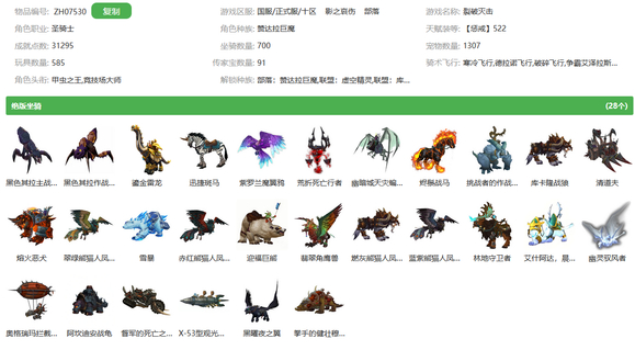 珍品老号,绝版甲虫之王头衔,700坐骑.绝版黑虫子 鎏金雷龙 安托犬 幽灵大鸟 凤凰 无敌 星光龙 飞机头 熔火狗 法典 魔能火鹰 雪暴 四色乌鸦等多稀有,绝版双黄金挑战骑士5.0幻化套+6.0武器全套, 蓝镰刀 泰沙拉克 风剑 考古大剑 风剑 橙锤 DH蛋刀等多武器幻化-QS四色光剑.四色隐藏灰烬-XD四色果冻熊-SM光锤等各职业神器外观-绝版XD星光猫-WS法师塔挑战,永恒精锐-T3救赎等超多幻化套装-[宇宙流光][寒冬之握][拉格怒焰]等多附魔,3W成就-1307宠物-585玩具-91件传家宝,LR多灵魂兽-已购年卡-雷龙礼包,游戏时间到25年9月![]() ![]() ![]() ![]() ![]() ![]() ![]() |