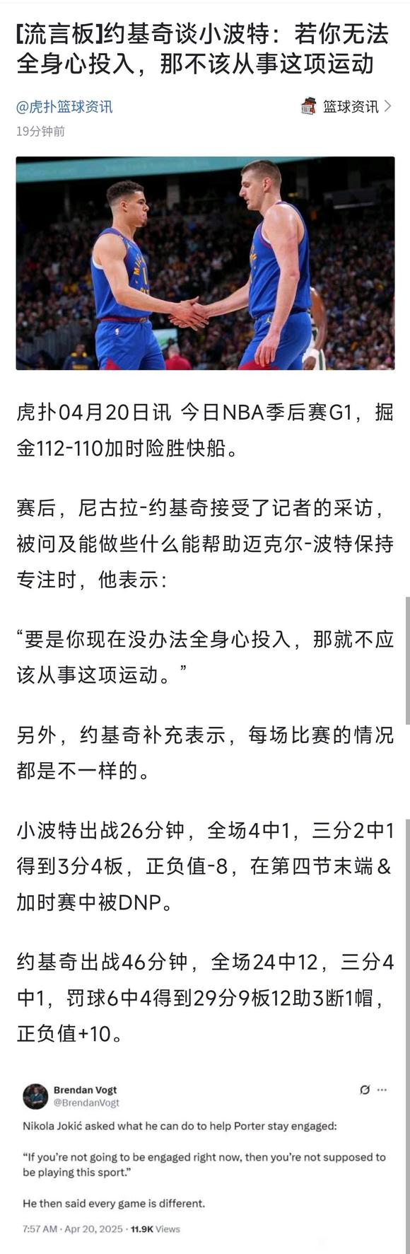 : 谁都知道什么问题。博格丹纯能力问题,直接放弃就行。老鲍绝对是态度问题,全明星后一直很独不合理的出手太多。约契奇詹姆斯库里就能痛斥队友的毛病,哈登也应该站出来把老鲍按住老实打球。去年乔治是牌子大,按不住 ...