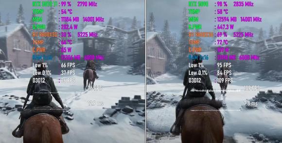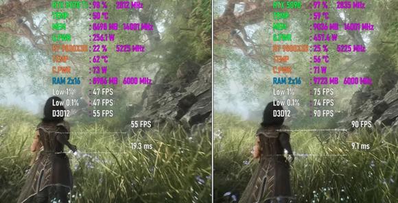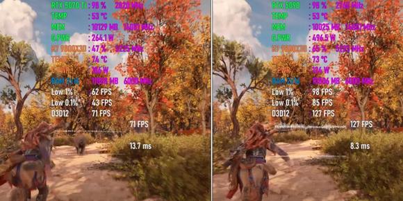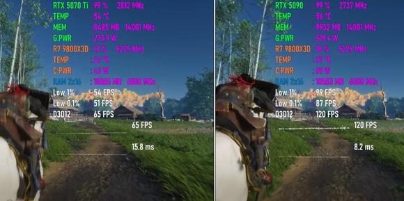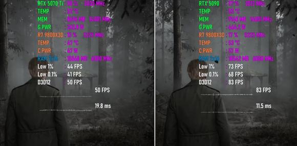 以下将分别测试七款游戏,均采用4K画质模式,以下系列图片中左边代表GeForce RTX 5070 Ti 16GB平台,右边代表GeForce RTX 5090 32GB平台。![]() 第一款游戏是《战神》。 GeForce RTX 5070 Ti平台的平均帧速为85 FPS,最低瞬时帧速为78 FPS,帧时间为11.7ms,CPU使用率为20%,功耗为64W,温度为52度,内存使用量为12.4GB,GPU使用率为99%,显存使用量为8.7GB,功耗为278W,温度为54度。 GeForce RTX 5090平台的平均帧速为163 FPS,最低瞬时帧速为142 FPS,帧时间为6.0ms,CPU使用率为32%,功耗为71W,温度为66度,内存使用量为11.5GB,GPU使用率为99%,显存使用量为8.9GB,功耗为537W,温度为59度。 在这款游戏中,GeForce RTX 5090平台的CPU使用率比对手高12%,内存使用量低0.9GB,GPU使用率相等,显存使用量高0.2GB,功耗高259W,温度高5度。 在平均帧速方面,GeForce RTX 5090平台比GeForce RTX 5070 Ti平台高78 FPS,领先约92%,最低瞬时帧速高64 FPS,帧时间低5ms左右。 ![]() 第二款游戏是《幽灵线东京》。 GeForce RTX 5070 Ti平台的平均帧速为65 FPS,最低瞬时帧速为54 FPS,帧时间为15.8ms,CPU使用率为13%,功耗为43W,温度为47度,内存使用量为10.9GB,GPU使用率为99%,显存使用量为8.5GB,功耗为274W,温度为54度。 GeForce RTX 5090平台的平均帧速为120 FPS,最低瞬时帧速为99 FPS,帧时间为8.2ms,CPU使用率为18%,功耗为59W,温度为57度,内存使用量为10.5GB,GPU使用率为99%,显存使用量为9.9GB,功耗为519W,温度为56度。 在这款游戏中,GeForce RTX 5090平台的CPU使用率比对手高5%,内存使用量低0.4GB,GPU使用率相等,显存使用量高1.4GB,功耗高245W,温度高2度。 在平均帧速方面,GeForce RTX 5090平台比GeForce RTX 5070 Ti平台高55 FPS,领先约85%,最低瞬时帧速高45 FPS,帧时间低7ms左右。 ![]() 第三款游戏是《光与影:33号远征队(》。 GeForce RTX 5070 Ti平台的平均帧速为55 FPS,最低瞬时帧速为47 FPS,帧时间为19.3ms,CPU使用率为22%,功耗为73W,温度为62度,内存使用量为9.0GB,GPU使用率为98%,显存使用量为8.7GB,功耗为256W,温度为50度。 GeForce RTX 5090平台的平均帧速为90 FPS,最低瞬时帧速为75 FPS,帧时间为9.1ms,CPU使用率为25%,功耗为71W,温度为56度,内存使用量为9.7GB,GPU使用率为97%,显存使用量为9.0GB,功耗为457W,温度为59度。 在这款游戏中,GeForce RTX 5090平台的CPU使用率比对手高3%,内存使用量高0.7GB,GPU使用率基本相等,显存使用量高0.3GB,功耗高201W,温度高9度。 在平均帧速方面,GeForce RTX 5090平台比GeForce RTX 5070 Ti平台高35 FPS,领先约64%,最低瞬时帧速高28 FPS,帧时间低10ms左右。 ![]() 第四款游戏是《地平线西之绝境》。 GeForce RTX 5070 Ti平台的平均帧速为71 FPS,最低瞬时帧速为62 FPS,帧时间为13.7ms,CPU使用率为47%,功耗为106W,温度为74度,内存使用量为11.9GB,GPU使用率为98%,显存使用量为10.1GB,功耗为264W,温度为53度。 GeForce RTX 5090平台的平均帧速为127 FPS,最低瞬时帧速为98 FPS,帧时间为8.3ms,CPU使用率为65%,功耗为124W,温度为73度,内存使用量为10.8GB,GPU使用率为98%,显存使用量为10.0GB,功耗为497W,温度为53度。 在这款游戏中,GeForce RTX 5090平台的CPU使用率比对手高18%,内存使用量低1.1GB,GPU使用率和显存使用量都基本相等,功耗高233W,温度相等。 在平均帧速方面,GeForce RTX 5090平台比GeForce RTX 5070 Ti平台高56 FPS,领先约79%,最低瞬时帧速高36 FPS,帧时间低5ms左右。 ![]() 第五款游戏是《寂静岭2》。 GeForce RTX 5070 Ti平台的平均帧速为50 FPS,最低瞬时帧速为44 FPS,帧时间为19.8ms,CPU使用率为13%,功耗为47W,温度为47度,内存使用量为10.9GB,GPU使用率为98%,显存使用量为8.7GB,功耗为264W,温度为52度。 GeForce RTX 5090平台的平均帧速为83 FPS,最低瞬时帧速为73 FPS,帧时间为11.5ms,CPU使用率为17%,功耗为57W,温度为53度,内存使用量为10.5GB,GPU使用率为97%,显存使用量为9.1GB,功耗为464W,温度为53度。 在这款游戏中,GeForce RTX 5090平台的CPU使用率比对手高4%,内存使用量低0.4GB,GPU使用率基本相等,显存使用量高0.4GB,功耗高200W,温度高1度。 在平均帧速方面,GeForce RTX 5090平台比GeForce RTX 5070 Ti平台高33 FPS,领先约66%,最低瞬时帧速高29 FPS,帧时间低8ms左右。 ![]() 第六款游戏是《黑神话悟空》。 GeForce RTX 5070 Ti平台的平均帧速为52 FPS,最低瞬时帧速为41 FPS,帧时间为19.3ms,CPU使用率为12%,功耗为44W,温度为50度,内存使用量为12.6GB,GPU使用率为97%,显存使用量为10.9GB,功耗为254W,温度为53度。 GeForce RTX 5090平台的平均帧速为97 FPS,最低瞬时帧速为79 FPS,帧时间为10.3ms,CPU使用率为17%,功耗为61W,温度为53度,内存使用量为13.4GB,GPU使用率为99%,显存使用量为11.7GB,功耗为500W,温度为61度。 在这款游戏中,GeForce RTX 5090平台的CPU使用率比对手高5%,内存使用量高0.8GB,GPU使用率高2%,显存使用量高0.8GB,功耗高246W,温度高8度。 在平均帧速方面,GeForce RTX 5090平台比GeForce RTX 5070 Ti平台高45 FPS,领先约87%,最低瞬时帧速高38 FPS,帧时间低8ms左右。 ![]() 第七款游戏是《最后生还者第二部》。 GeForce RTX 5070 Ti平台的平均帧速为76 FPS,最低瞬时帧速为66 FPS,帧时间为12.9ms,CPU使用率为30%,功耗为85W,温度为64度,内存使用量为13.3GB,GPU使用率为99%,显存使用量为11.2GB,功耗为282W,温度为54度。 GeForce RTX 5090平台的平均帧速为109 FPS,最低瞬时帧速为95 FPS,帧时间为7.8ms,CPU使用率为69%,功耗为109W,温度为72度,内存使用量为13.2GB,GPU使用率为98%,显存使用量为12.6GB,功耗为447W,温度为58度。 在这款游戏中,GeForce RTX 5090平台的CPU使用率比对手高39%,内存使用量和GPU使用率都基本相等,显存使用量高1.4GB,功耗高165W,温度