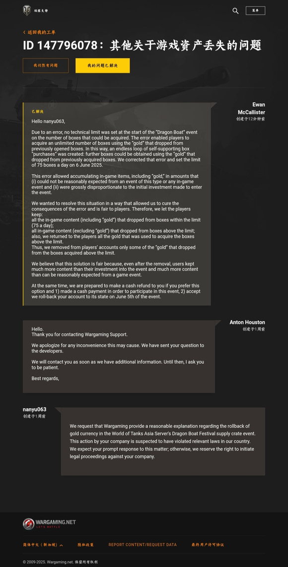 中文翻译:尊敬的nanyu063:因系统错误,"端午龙舟"活动初期未对宝箱获取数量设置技术限制。该错误导致玩家可利用已开启宝箱掉落的"黄金"无限制获取新宝箱,从而形成自给自足的无休止开箱循环。我们已于2025年6月6日修复此问题,并设定每日获取上限为75个宝箱。此漏洞致使玩家累积了严重超出预期的游戏资源(包括"黄金"):其数量远超该类活动或任何游戏活动的合理范畴;与参与活动的初始投入严重不成比例。为公平处理本次错误的影响,我们采取以下补偿方案,允许玩家保留:每日上限(75个)内开箱所得全部游戏资源(含"黄金");超额开箱所得的全部非"黄金"资源;同时退还所有用于超额开箱的"黄金"。因此,我们仅从玩家账户移除了超额宝箱产出的部分"黄金"。该方案具备合理性:即便移除部分资源后,玩家所获内容仍远高于活动投入成本,且远超正常游戏活动的预期收益。若您符合以下条件,我们亦可提供现金退款方案:曾为参与活动进行现金支付;同意将账户回档至2025年6月5日活动初始状态。此致