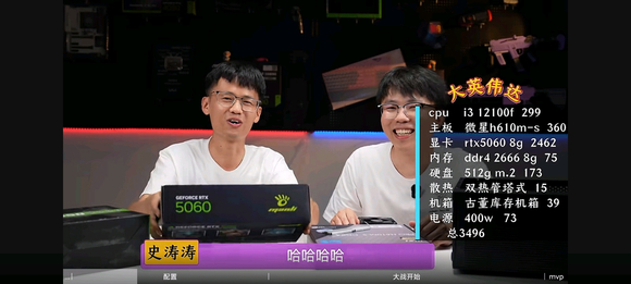 : 这一期真是要反复观看了,5600用12100f和2666单条8g条子差点夺冠,我一开始还认定这玩意游戏要闪退来着