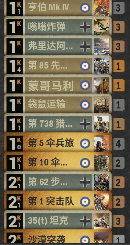 | 用了一些很新的组件,比如最新的手册,却又有古早的单位选择,体验最极致的指令和最老套的单位交换,如同紧追步伐的旧日明星,体验紧张刺激的奋战英国单位,别样的英德老年迪斯科🪩 老年迪斯科() Major power: Britain Ally: Germany HQ: 亚历山大港 Britain: 1x (1K) 袋鼠运输 2x (1K) 第 10 伞兵营 4x (1K) 第 5 伞兵旅 1x (1K) 第 85 先锋连 3x (1K) 亨伯 Mk IV 1x (1K) 蒙哥马利 2x (2K) 第 1 突击队 1x (2K) 沙漠突袭 2x (3K) 第一响应 3x (3K) 飓风 Mk IIa 1x (3K) 空降 1x (3K) 沙尘满目 3x (3K) 瓦伦丁 Mk III 1x (3K) P-40 小鹰 1x (4K) 喷火 Mk IIa Germany: 1x (1K) 第 738 猎兵团 3x (1K) 弗里达阿姨手册 3x (1K) 嗡嗡炸弹 3x (2K) 35(t) 坦克 2x (2K) 第 62 步兵团 %%21|0m191DgpgPlvoUpMpO;1WoBotqk;1S1u4ppZq8qb;hS ![]() ![]() ![]() |