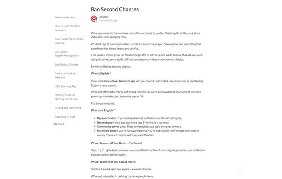 自2013年以来,为了保护游戏的公平性,我们永久封禁了超过一百万个账号。这一点我们不会改变。 我们从不后悔封禁作弊者。《Rust》是一款竞争性强、由玩家驱动的游戏,保护这种游戏体验始终是我们最重要的优先事项之一。 时间流逝,人也会长大,观念也会改变。我们并不天真,但我们确实相信,并非多年前被封禁的人今天还是同样的人,有些人可能只是犯了一个愚蠢的错误。因此,我们愿意提供一次重新开始的机会。谁有资格获得这次机会? 如果您在8个月前被封禁,并且此后没有再次违规,那么您可以购买一个新的账号重新游玩《Rust》。 我们不会解除原有的封禁,也不会清除记录,但我们承认,你们中的一些人已经长大,放下了过去,准备好公平地玩游戏。这是您唯一的一次机会。谁没有资格?惯犯:如果您曾多次被封禁,则不适用于此政策。近期被封禁者:如果您的封禁发生在最近8个月内,现在还为时尚早。社区服务器封禁:这些由服务器管理员单独处理。硬件封禁:如果您被硬件封禁,则不符合条件——不要浪费您的时间和金钱。硬件封禁仅针对屡犯者。如果您过早返回会发生什么?如果您在原账号被封禁后的8个月内尝试通过新账号重新进入《Rust》,很可能会被检测到并再次封禁。如果您再次作弊会发生什么?您将再次被封禁,且不可申诉,也没有更多机会。我们不想重复管理同一批人两次。