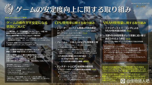 | 【提高游戏稳定性的措施】 目前,我们收到了很多关于游戏稳定性提升的意见,主要是关于Steam版《怪物猎人wilds》。 在本篇文章中,我们将向大家通报我们在提高游戏稳定性方面所做的工作。 1错误修正 游戏更新第2弹(以下简称TU2)发布时,由于以下问题,可能会导致游戏强制结束或帧率下降。 选择“装备外观设置”可能会强制退出游戏 ·使用远距离武器时,可能会导致帧速率不稳定(Steam版) ※已在7/1(二)发布的修补程序(Ver.1.020.01)中修正 如果遇到这个问题,给大家带来了麻烦,非常抱歉。 对于其他确认的问题,将在调查结束后依次进行修正。 2 CPU使用率问题 <关于着色器编译的问题修复> TU2修正了“在游戏过程中进行着色器编译,可能导致游戏运行不稳定的问题”。 TU2以后,除了消除了因本故障而产生的CPU负荷之外,今后也不需要实施过去介绍的“着色器缓存删除对应”。 <伴随帧速率提高的CPU使用率上升> 提高本机帧速率会导致CPU使用率增加。 如果帧速率上限设置为无限制或更高,则会通过最大限度地使用CPU来提高帧速率。 请注意,这会导致CPU使用率过高。※根据使用环境设定帧速率上限等各种显卡选项,可以降低CPU使用率。 以下是我们为降低CPU使用率而采取的措施。 1.支持DLSS4/FSR4(TU2已支持) TU2支持最新的超分辨率技术DLSS4和FSR4,增加了旨在在减轻CPU负荷的同时提高帧速率的选项。 2.限制CPU使用率的功能(讨论中) 面向担心长时间游玩本作品时CPU使用率持续高的状态,会给您的PC(特别是使用了各厂商报告运行不稳定的部分CPU的情况等)带来负担的人目前正在考虑增加限制CPU使用率(运行线程数)的功能。 详细情况和对应时间决定后会立即通知,请稍候。 <反作弊和CPU使用率的关系性> 在TU2中,反作弊的检查处理减少了约90%。※反作弊的检查处理并不是逐帧进行的 另外,TU2虽然实施了针对“非法调查任务”和“争夺讨伐时间的任务中的非法通关时间”的对策,但这些都会在游戏中产生持续的负荷。 3关于VRAM使用量的措施 TU2在VRAM使用方面采取了以下措施: ·通过纹理流减少VRAM的使用 ·修正显示设定·图形设定中显示的“预测VRAM使用量”,使其显示更接近实际值 另外,如果VRAM不足,安装“高分辨率纹理包”(必须16GB的VRAM)后,无论“纹理品质”的设定如何,游戏都可能无法正常运行。请根据您的环境进行配置,以及其他显卡选项。 4个别环境引起的情况 对于游戏运行不稳定的情况,我们会继续进行调查和验证。 由于使用环境的不同,存在各种原因,因此在确定原因上需要花费时间,游戏方面也会出现一定数量的难以应对的情况,但我们会在确定出可以改善的部分后,依次进行应对。 关于个别环境导致的病例,我们确认了以下事例。 ·图形驱动程序的版本 ·硬件状态 ・OBS Studio等部分捕获软件(也取决于版本和驱动构成等) ※TU2会对游戏在使用环境中可能无法正常运行的部分情况进行修改,以显示提示您重新安排环境的对话框。 4结束 今后,为了让更多的人安心舒适地游玩,我们会继续努力提高游戏的稳定性。 具体的应对内容请参考《#MHWilds反馈报告」等,随时通知。 今后也请多多关照《怪物猎人wilds》。 ![]() |