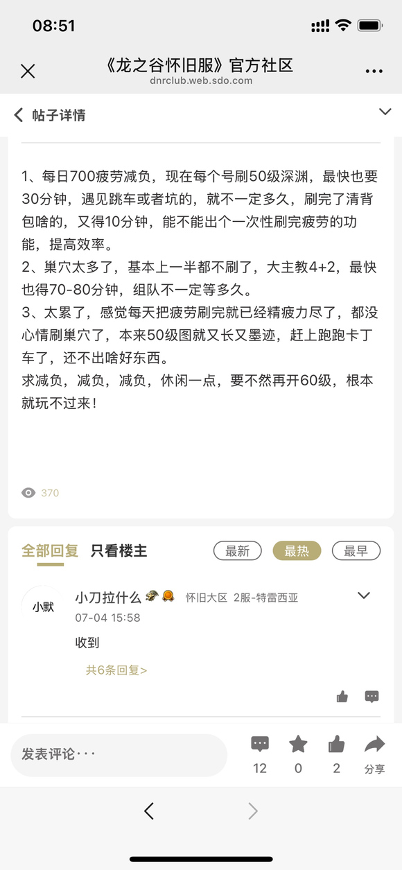 组队半小时,你可以单刷把,你要是不能单刷,巢穴你能进去?一个号背包清十分钟?你背包里有什么好东西让你挑来挑去十分钟?你多少个号啊,刷完疲劳就不想刷巢穴了。这个帖子的人说话真的低能,为了能减负说屁话。