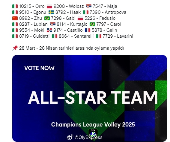 女排欧冠“全明星队”评选网络投票得票明细,奥罗10215票,服了