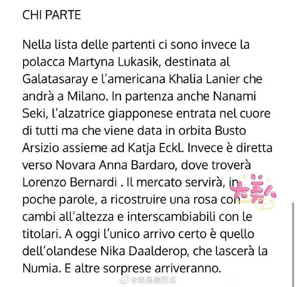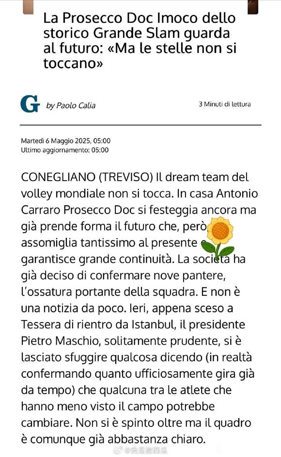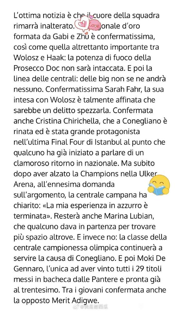 | 🇮🇹意大利媒体报导 (科內利亚诺合作媒体) 《历史性大满贯赛的科内利亚诺展望未来:“但明星阵容不可撼动”》 世界排球梦之队,无人可撼动。在科内利亚诺仍在庆祝时,未来已初见端倪,与现在非常相似,并保证了良好的连续性。俱乐部已经确定了9名黑豹队员,他们是球队的主力。这可不是什么小新闻。昨天,一向谨慎的总裁皮埃特罗·马斯基奥(Pietro Maschio)从伊斯坦布尔返回泰塞拉(Tessera)时,刚下车就透露了一些消息(实际上证实了一段时间以来非官方流传的消息),一些很少上场的运动员可能会被替换。他没有进一步透露,但形势已经相当明朗。 谁将留下 好消息是球队的核心将保持不变。 加比和朱婷形成的黄金对角线已得到确认,沃洛什和哈克之间同样重要的黄金对角线也已确认:科内利亚诺的火力不会受到影响。然后是核心球员阵容:所有大牌球员都不会离开。法尔已确认,她与沃洛什的默契如此精妙,打破这种默契简直是罪过。奇里切拉也已确认,她在科内利亚诺重获新生,并在伊斯坦布尔举行的女排欧冠四强赛中发挥了重要作用,以至于有人已经开始谈论她将重返国家队。但在尤尔克竞技场捧起欧冠奖杯后,这位来自坎帕尼亚的核心球员立即澄清道:“我的国家队生涯结束了。”卢比安也将留队,有人认为她会离开去其他地方寻找更大的空间。但事实并非如此:这位奥运冠军核心球员将继续为科内利亚诺效力。接下来是德吉纳罗,他是唯一一位赢得黑豹队全部29个冠军的球员,并且已经准备好迎接第30个冠军。在年轻球员中,阿迪格韦也已确认留队。 谁会离开 离队名单包括前往加拉塔萨雷的波兰球员卢卡西克和前往米兰的美国球员拉内尔。同样离开的还有日本二传手关菜菜巳,她已经深得大家喜爱,但她和埃克尔一起加入布斯托·阿西齐奥。安娜·巴达罗 (Anna Bardaro) 前往诺瓦拉 (Novara),在那里她会找到洛伦佐·贝尔纳迪 (Lorenzo Bernardi)。简而言之,市场将用于重建一支能够胜任任务并与首发球员互换的球队。到目前为止,唯一确定的抵达者是荷兰人尼卡·达尔德罗普,他将离开米亚。更多惊喜即将到来。 🤩 期待#朱婷留洋第七季# 💗 @女排朱婷ZT 一路婷你🫶🏻 好好休息,陪伴家人朋友 🥺 舍不得离开的队友,特別是二墩、卢卡西克,祝大家未来都好好的 ![]() ![]() ![]() ![]() ![]() ![]() |