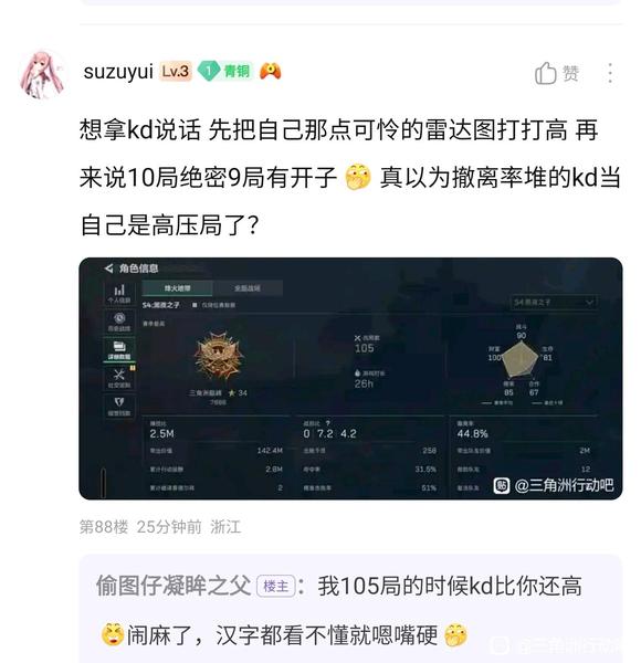 为什么5kd大人在105局的时候能5kd 怎么数据越打越差了? 我懂了 因为全被开子锁完了 所以局数>人头数 51撤离率 67战斗值 拼尽全力打到了4kd 一定是这样吧