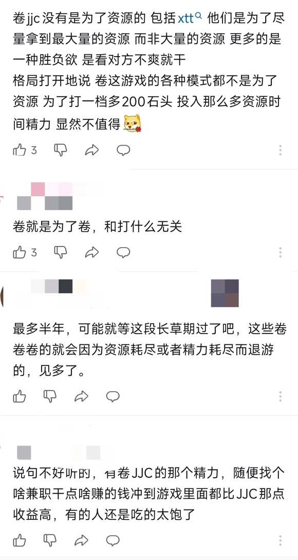 | 我个人在最近一个xtt贴下面说了“近乎零收益的东西不值得浪费时间”,然后一个大哥帮我统计了这个xtt的收益,他的原话是“0收益?笑死,一年一档和二档也就差2400,一年JJC吃一和前百差5000钻,还有9000JJC币”,有没有一种可能我之前自己也发过帖子说过自己想根的时候就会算碎票到底值不值得,真有那么多人觉得那点石头和jjc币值得自己去红温以及另花石头碎票(从上个赛季开始只要不是天堂场不碎票个人觉得有1/3时间能吃一都算好的了)花时间(如果加入xtt则增加时间成本减少其他成本)去打吗,真正的根批也从来不是奔着资源去根的,他们喜欢(真的喜欢吗)的是这种玩法,而不是那点奖励。那么也顺着上面这位大哥的话回到xtt的最终目的——收益,就算你本来只能吃前百(真有常驻30开外的想着要天天吃一吗。。。),通过xtt能让你每天吃一,让一年的收益“高达”5000钻和9000jjc币,那有没有一种可能实际上你这一年混群并且准时上游戏的青辉石收益连一单518都不值呢,9000jjc币算下来的体力也就只有9张体力卡罢了,你要是一个赛季能拿这么多我觉得还真可以,一年。。。得了吧。那么xtt实际获得是什么呢,我也不知道,只是觉得挺闲的。在年初有个什么🐟的up的xtt闹翻视频底下就有评论(如图)说的很好,顺带说一句你游一档只要稍微跟着大部队规划一下真花不了太多精力跟资源,当然卷前排是另一回事,将近一个月一次随手打一下的每年2400钻跟一年每天都要固定时间进攻下防的5000钻和9000jjc币我固然会选择前者。 也希望这么长的一段话能给一些萌新点启迪吧,本来就是个盆栽游戏,有时间给这个游戏就稍微卷一卷,没有就摆烂,不要被排名这种东西过度影响了本心,我自己是比较讨厌xtt(这跟非法固排组队有什么区别)的所以带了点主观情感,如有错误欢迎更正。 ![]() |