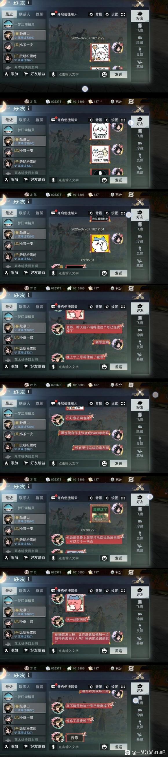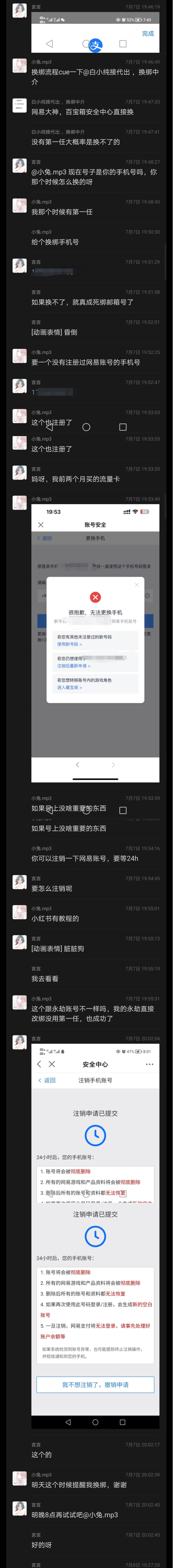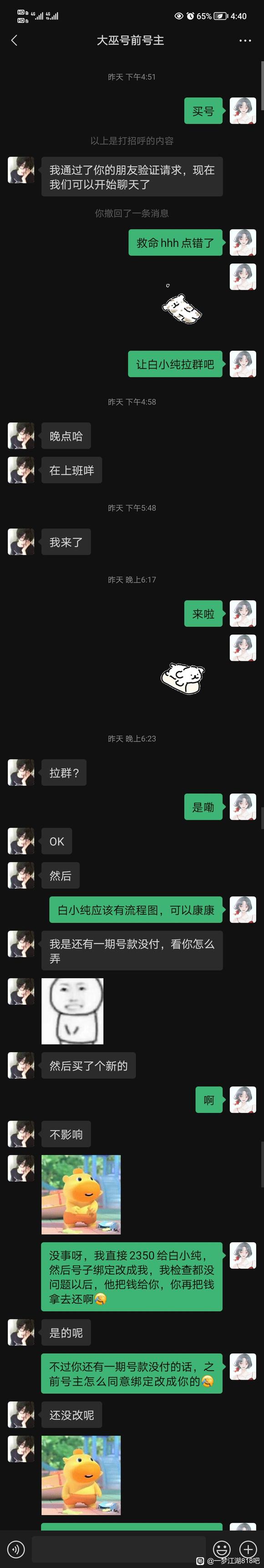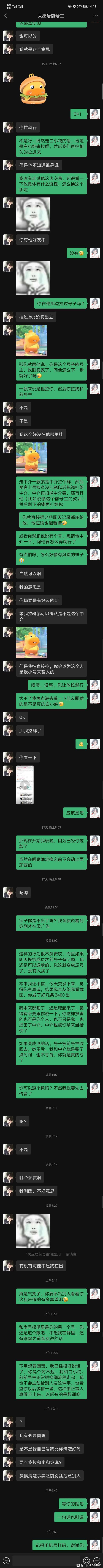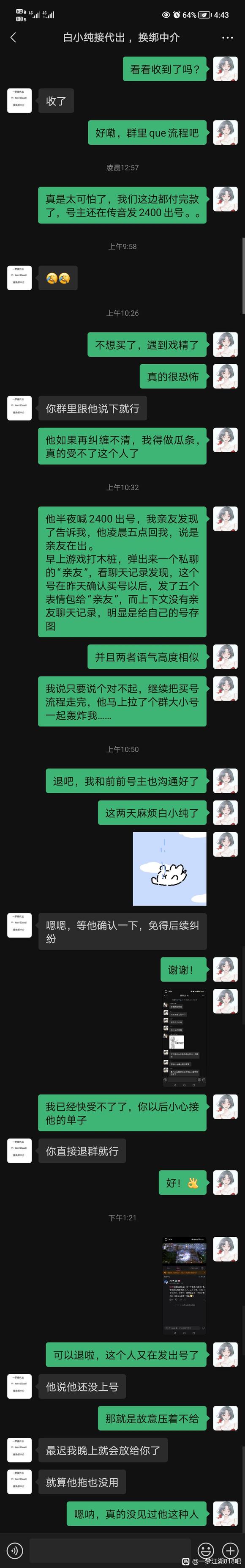 | 写在开头,专门下的贴吧,以前只吃亲友转发的瓜,没想到有一天要自己写。也不知道要发哪个贴吧,看这个贴吧名字比较符合,就发在这里。 我昨天7.7日下午,开价2300可以马上收,卖家说2350,我接受了,买了“稚女”,8.5官渠化灵踪大巫号,加了v,也拉了中介和前前号主,一共是四个人在交易小群里。 给中介付了款,检查了号没问题,我连衣服也没换,只把宝石装上,昨晚和今天早上打了两次木桩。其他什么也没做,什么也没动。 (因为卖家是分期,绑定信息还是前前号主的。我注销网易支付把新的手机号空出来,需要一天时间换绑,原定今晚8点换绑) 等待期间,发现前号主,也就是卖家,7.8凌晨在游戏里继续发布卖号信息,说2400急出【p1】 被我发现,我说只要道个歉就可以了。他一口咬定是亲友代发,早上我打木桩的时候,用自己另一个号假装亲友来私聊我。 查看聊天记录,发现并没有日常亲友聊天信息,而在7.7下午确认买号后,此号给和尚号发了多张表情包(我们玩家有一个习惯,换号会把喜欢的表情包发给新的号去存,所以我觉得99%的可能性是他自己的号)【p2】没做过长图,糊的话我一张张发评论区。 我依然坚持道个歉就可以,不会把这件事情主动跟别人说。 结果他马上拉了小群和所谓的这个亲友在群里骂我,后面还又拉了一个继续辱骂我。不论是不是精分,骂我都是事实。我受不了,决定不买了,卖家坚持不让中介退款。下午我在传音避雷他,卖家开了数个号,连着举报我三个号,还造谣已经换绑成我【p3】。我玩了五六年,从来没见过这种人。在此也感谢帮我说话的少侠,谢谢你们!(深深鞠躬 现发所有记录,少侠们自行观看。买这个人的号,需谨慎!手都在抖,真的很愤怒,很心酸…… 和卖家聊天记录沟通全过程(p4—p5) 和中介聊天记录全过程(p6) 我、卖家、中介、前前号主交易群全过程(p7,8) 最底下我发了一句不买,退款,然后退群了。 被拉群群里三个号辱骂(p9) 太多了,不让发那么长,剩余想看的我还会再开一条。 最后,希望大家不会遇到这样的卖家! 卖家,我不像你,被你ex以后我坚决没上号,而你做亏心事,怕我会上线,急着去改密码,真令人发笑!有这样的时间,把分期钱还了,让前前号主绑定你,不就行了吗?! ![]() ![]() ![]() ![]() ![]() ![]() ![]() ![]() ![]() |