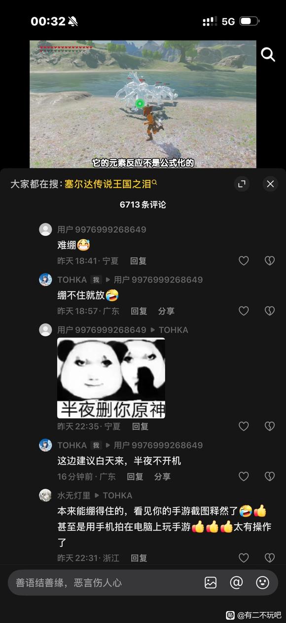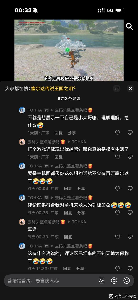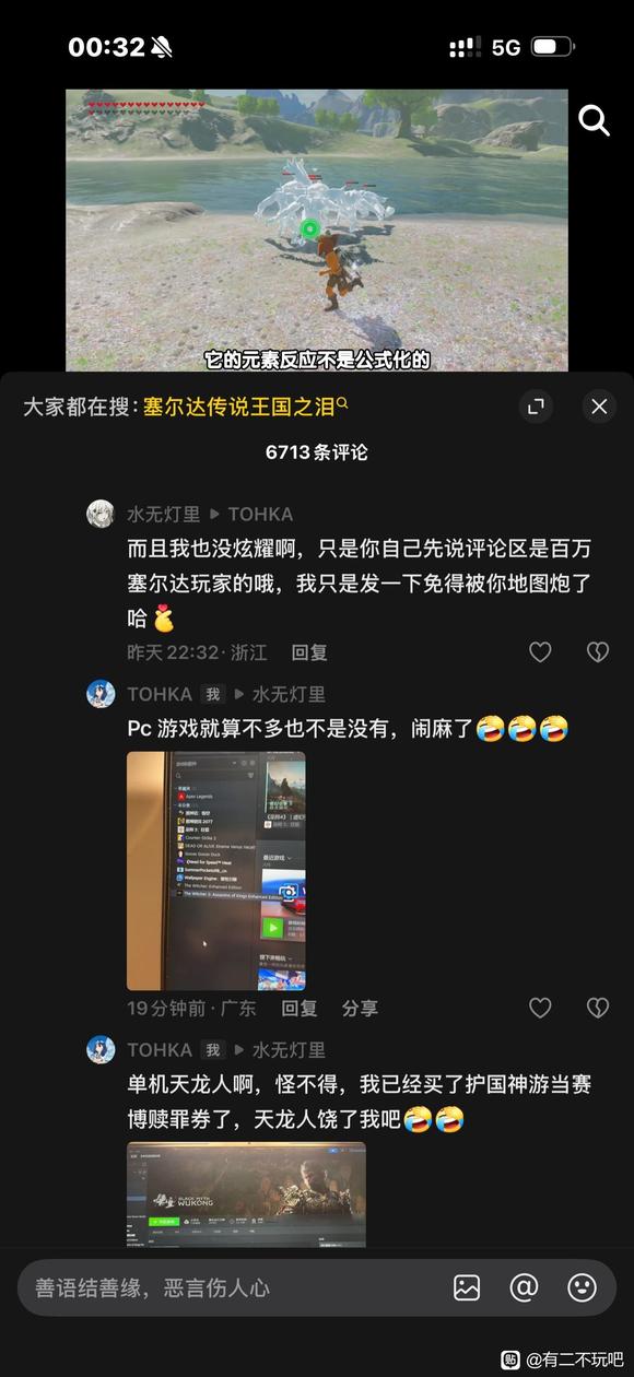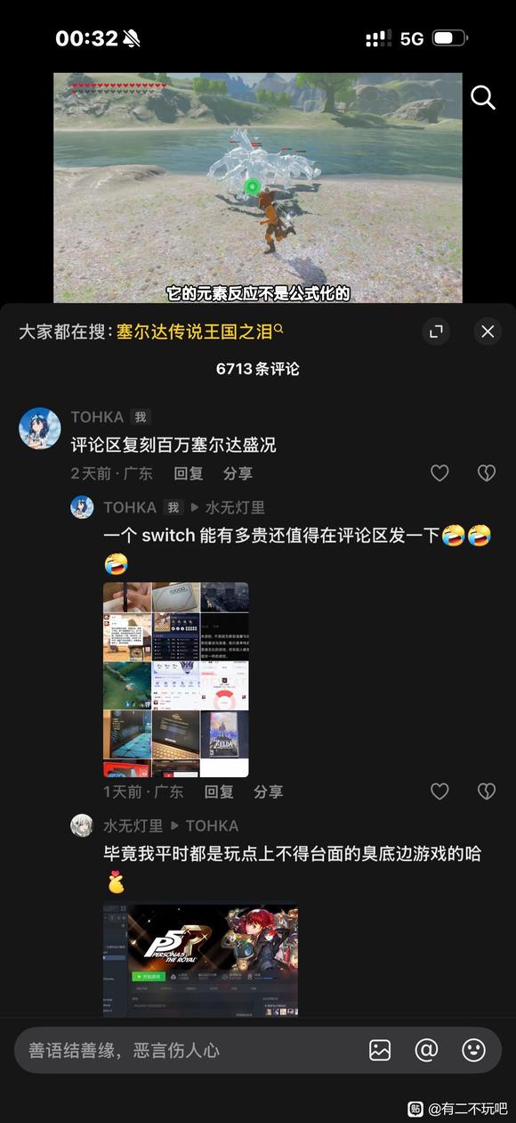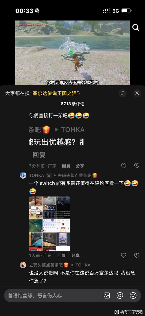 : 这是塞尔达“元素反应”的评论区可能是评论被吞了,刚开始回复的这俩人给我发了张 switch 的图片说扣 1 送,但是天龙人没想到的是我也有 switch ,然后就发生了如下对话 ...