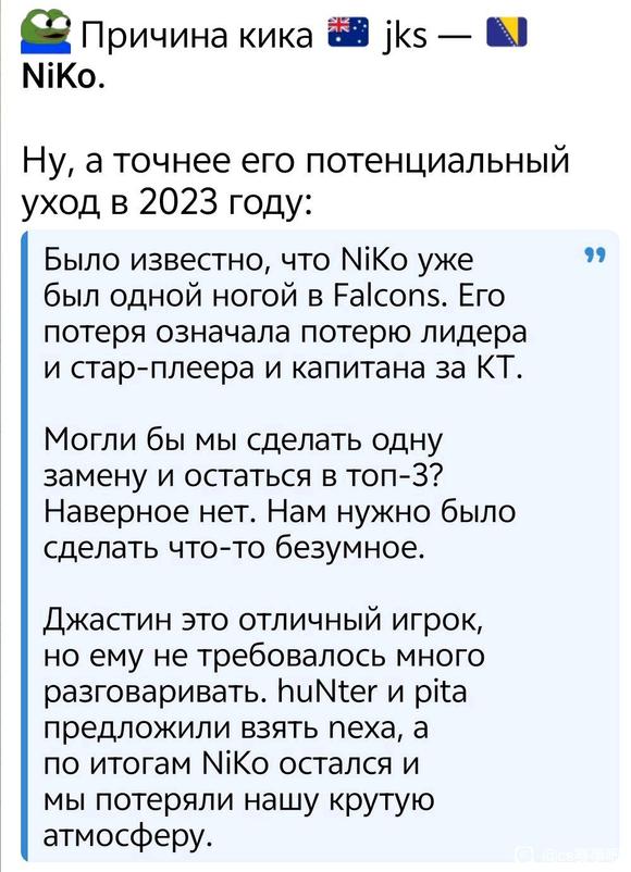 : Deepseek参考翻译如下:# 被踢的原因**jks — NIKO。**准确地说是因为他可能在2023年离队:当时Niko已经半只脚进了Falcons。失去他就意味着失去领袖、明星选手和CT方的指挥。我们只换一个人能保持世界前三吗?恐怕不 ...