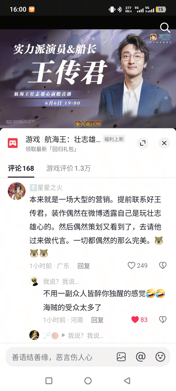 虽然但是,王传君有可能真的喜欢海贼但是这次联动绝对是合作……游戏出了也挺久了早咋没有他分享海贼手游的消息,完了不几天就确定要上官方直播咋可能这么巧就找王传君安排档期这事就不可能是这几天就完成的