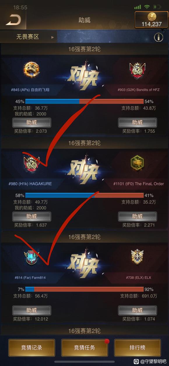 比赛进入到后期,竞猜基本都是一边倒的,很难再捡到漏了🤣