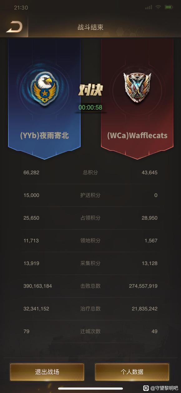 WCa虽然有一名大佬坐镇,但中坚力量还是有着差强人意,塔基本上都建不起来,最远只建到第一个钥匙哨塔附近,之后就全面被压制,防御塔被逐渐清理到0。或许是持续的压制消磨了他们的战意,后期WCa放弃防御塔的建设,转而全力争夺建筑占领权,结束后建筑分Wca还要高出我们一头,我们胜在了领地积分与钥匙。还好本场丸子和蟑螂都在,否则胜负难料。