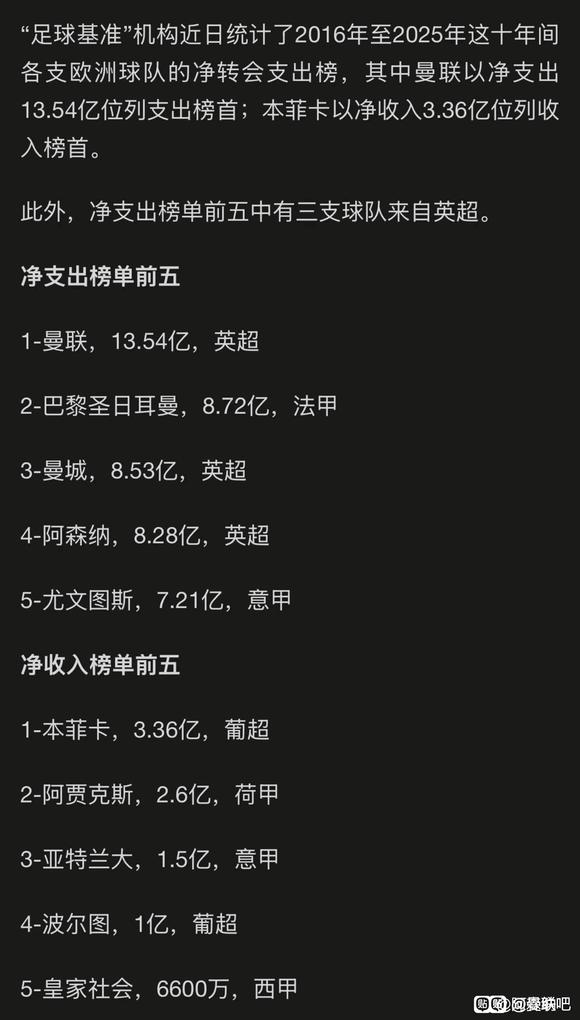 不能仅看这个,免签球员的签字费算不算?超高的薪酬结构算不算?哈兰德的转会费并并不高,签字费和工资有多少队给得起?梅西内马尔姆巴佩的工资一次养三个多少队受得了?钱多多为什么叫钱多多?再如皇马,近十年转会花了不到1亿,那贝林和姆巴佩怎么来的,吕迪格阿拉巴阿诺德?真不花钱么?