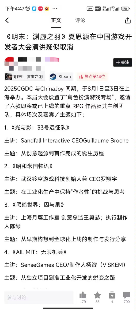 《明末:渊虚之羽》夏思源在中国游戏开发者大会演讲疑似取消