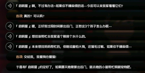 这暗示的挺明显的吧,启明星说她过段时间要出远门,然后和主角互相也约好了主角会帮她照顾宠物,活动过程我都想好了,启明星出远门前交给主角钥匙,主角去她家帮她照顾小动物,然后每日再加一下额外随机事件,比如去给邻居买菜、帮启明星打扫一下屋子啥的,靠,策划你最好快点做出来我等不及了
