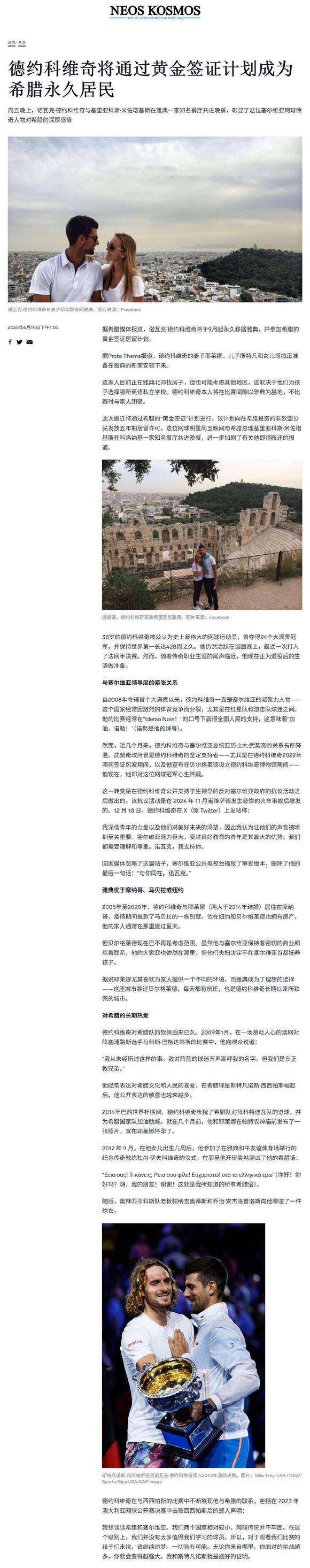 | 转自微博德约超话,真实性不负责 据希腊媒体报道,诺瓦克·德约科维奇将于9月起永久移居雅典,并参加希腊的黄金签证居留计划。 周五晚上,诺瓦克·德约科维奇与希腊总理米佐塔基斯在雅典一家知名餐厅共进晚餐,彰显了这位塞尔维亚网球传奇人物对希腊的深厚感情。 据Proto Thema报道,德约科维奇的妻子耶莱娜、儿子斯特凡和女儿塔拉正准备在雅典的新家安顿下来。 一家人目前正在雅典北郊找房子,但也可能考虑其他地区,这取决于他们为孩子选择哪一所英语私立学校。德约科维奇本人将在比赛间隙以雅典为基地,不比赛时与家人团聚。 此次搬迁将通过希腊的“黄金签证”计划进行,该计划向在希腊投资的非欧盟公民发放五年期居留许可。这位网球明星周五晚间与希腊总理基里亚科斯·米佐塔基斯在科洛纳基一家知名餐厅共进晚餐。 ![]() |